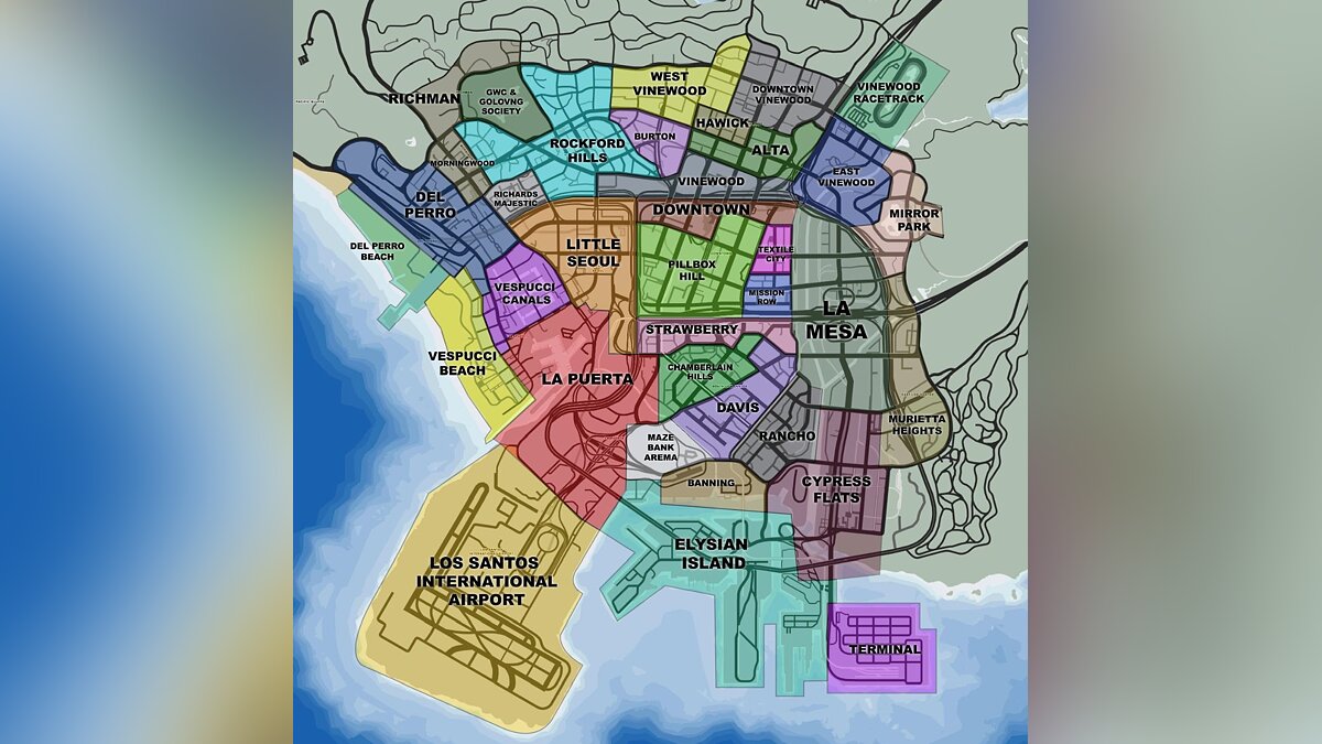 Для ГТА 5 Rockstar воздвигла обширный и по-настоящему живой город с разнообразными ландшафтами, впечатляющими пейзажами, множеством мест для исследования, величественной архитектурой зданий и запредельным числом активностей. Виртуальное воплощение города Ангелов состоит из множества районов, каждый со своей уникальной эстетикой и атмосферой, что опирается на разные культурные и медийные паттерны — будь то блеск Голливуда или суровая реальность гетто, отражая реальный прототип. Перечислим основные: