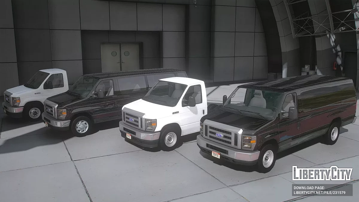 Ford E350 для GTA 5. Передняя часть: Вертикальная массивная решётка радиатора с крупным логотипом Ford подчёркивает утилитарный и надёжный характер автомобиля. Прямоугольные фары с жёлтыми указателями поворота обеспечивают хорошую видимость и пр...