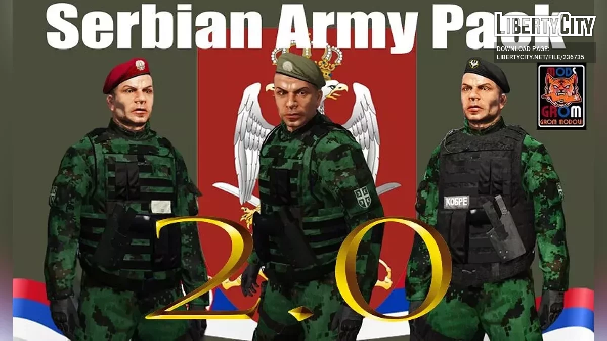 Сборник солдат Вооружённых сил Сербии версии 2.0 . Каждый солдат индивидуально упакован и сжат с первоначальных 30 000 КБ до 14 000 КБ, а затем до 6 800 КБ в OpenIV. Это значительно повысило стабильность игры без потери визуального качества унифор...