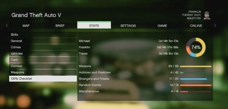 А вот и еще один пример: у каждого из главных героев есть своя статистика вождения, стрельбы и других основных способностей, которые со временем улучшаются. То есть, чем больше вы играете в GTA 5, тем легче вам будет. Также у каждого героя есть шкала особых умений, которая постепенно заполняется. Франклин может замедлять время во время вождения, чтобы лучше вписываться в повороты, такое же замедление времени и у Майкла, только оно помогает ему в стрельбе, а Тревор начинает наносить в два раза больше урона, при этом получая в два раза меньше повреждений.