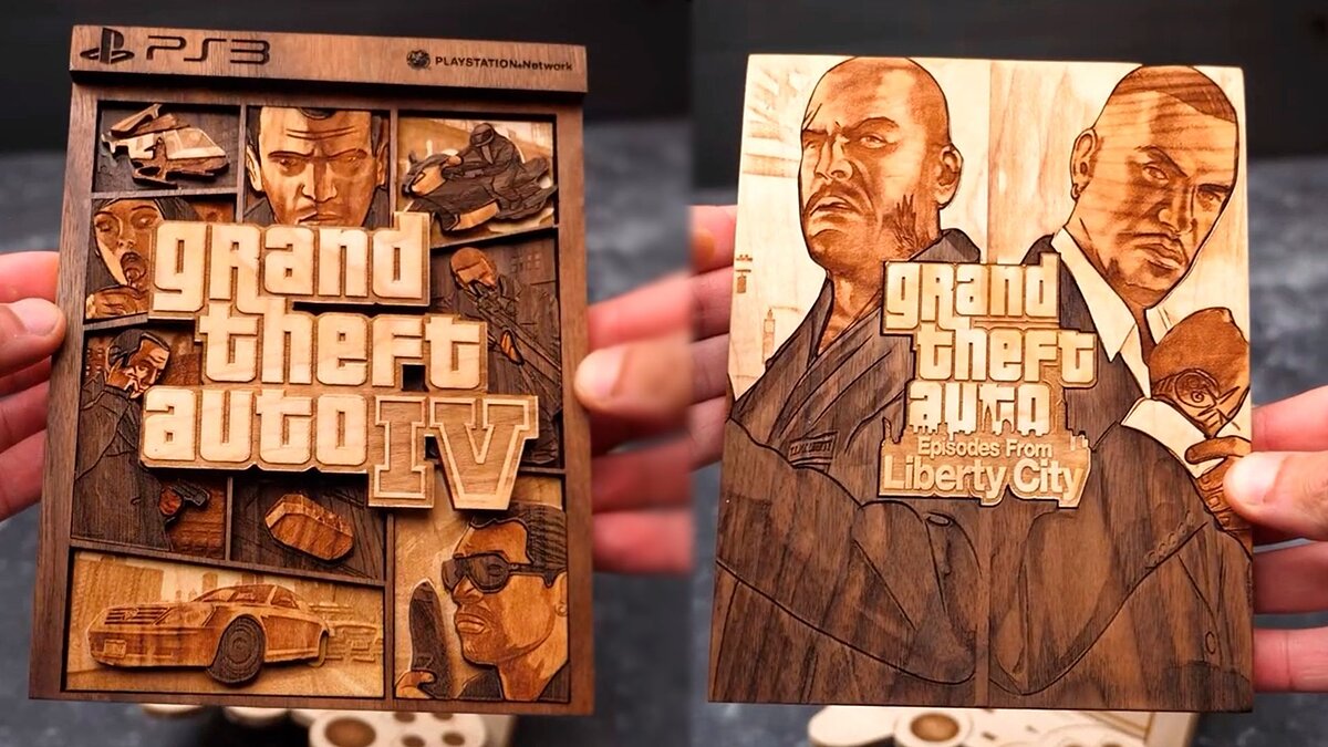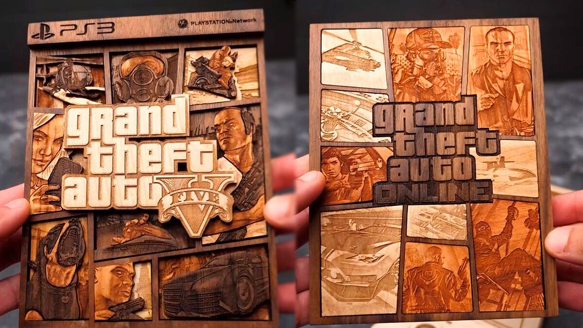 Еще один умелец, очевидно владеющий нужными станками, изготавливает и продает деревянные коробки для игр, включая серию GTA. Его фишка — искусная гравировка и возникающий естественный 3D-эффект. Объекты и персонажи выглядят так, будто выдавлены на разных уровнях глубины. Образцами для работы служат оригинальные упаковки игры — те самые пластиковые контейнеры, в которых раньше лежали диски. У него на сайте можно найти обложки для всех выходивших GTA, а также других игр. Цена одной такой коробочки соответствующая: 140-150 долларов (12 500-14 000 рублей).