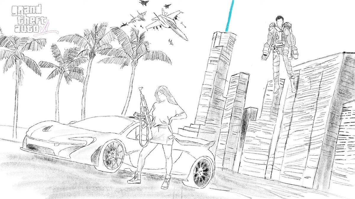На рисунке известного инсайдера Тома Хендерсона, который он сделал до утечки, была изображена девушка возле спорткара, напоминающего McLaren, и парень на реактивном ранце. Том оказался прав насчет сеттинга, места и героев новой GTA. Следовательно, в GTA 6 нас может ждать еще больше интересных образцов транспорта.