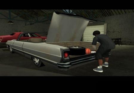 На скриншоте мы видим гараж в Сан Фиерро. Гараж заметно отличается от нынешнего гаража. Возможно, этот скриншот из ранней версии игры. Так же мы видим Сиджея, который копается в багажнике автомобиля (обратите внимание, как проработан багажник). В релизе ничего такого не имеется, да и сам гараж для посещения не доступен.