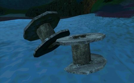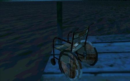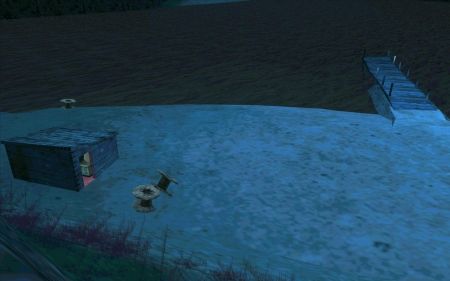 Ну и на десерт самые интересные места! Первое местечко под названием “Лагуна рыбака” представляет из себя песчаный берег озера, которое я упомянул ранее. На берегу расположилась будка с несколькими коробками внутри, на песке лежат несколько дисков для намотки кабеля, от берега отходит пристань, а на ней – инвалидная коляска: