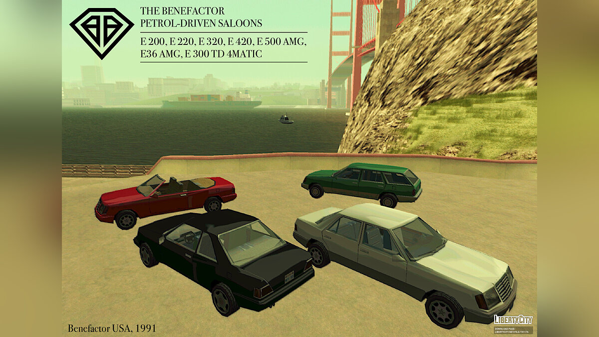 Benefactor E-Class был создан на базе оригинального Admiral и Mercedes-Benz E-Class W124. Модификация выполнена в оригинальном стиле игры, использует оригинальные игровые детали и низкокачественную модель. Авто выполнено в цветах, в которых Mercedes-Benz E-Class W124 продавался в автосалонах своего времени. Модель можно добавить без замены других авто.