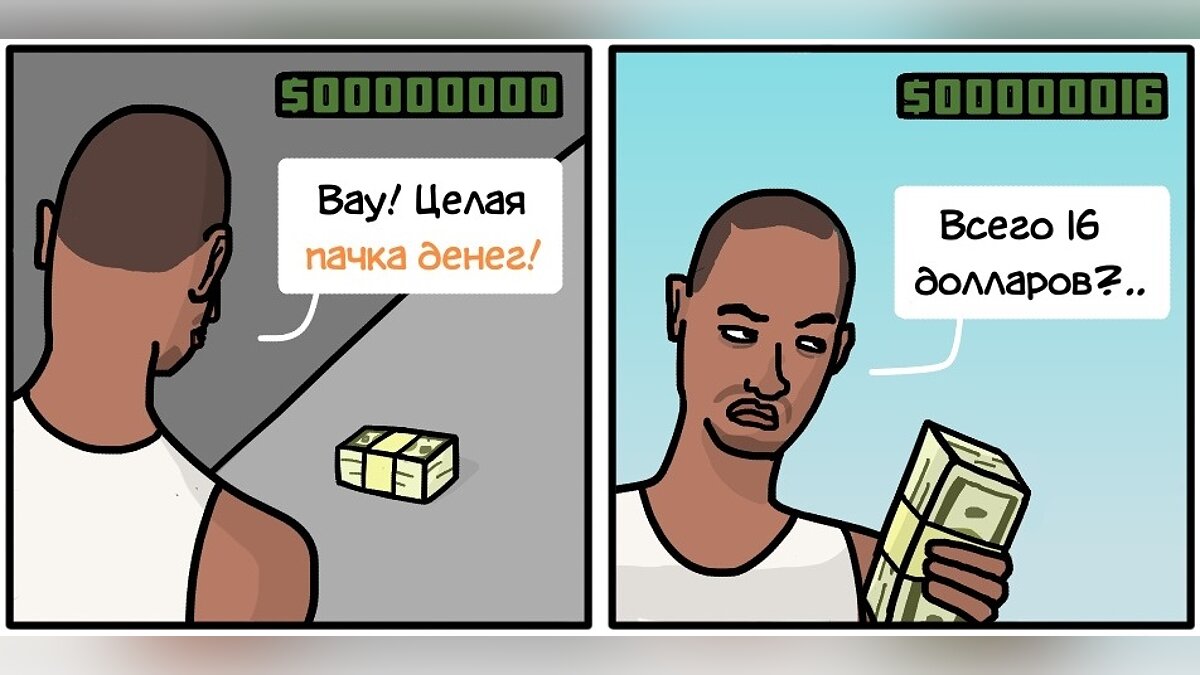 В играх серии GTA несколько долларов выглядят как огромная пачка денег. На раннем этапе прохождения это может вызвать лёгкий диссонанс. Впрочем, подобная условность встречалась и в других проектах. Например, горы золота, которые охраняли драконы в Gothic 2, оказались не интерактивными.