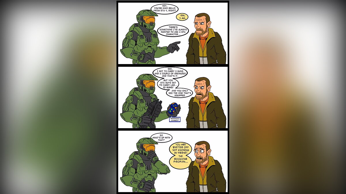 Мастер Чиф из серии Halo искренне не понимает, как Нико Белик носит с собой сразу десяток стволов, в то время как сам спартанец не может взять больше двух винтовок.