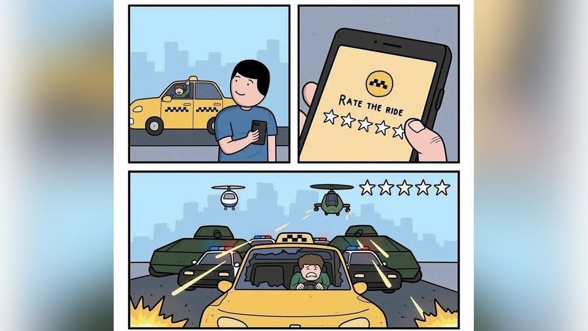 В современных приложениях, благодаря которым мы вызываем такси, есть рейтинги у водителей и пассажиров. После окончания поездки можно поставить оценку, от 1 до 5 звёзд. Фанаты GTA заметили, что они напоминают уровень розыска из пятой части. В результате родился забавный мини-комикс.