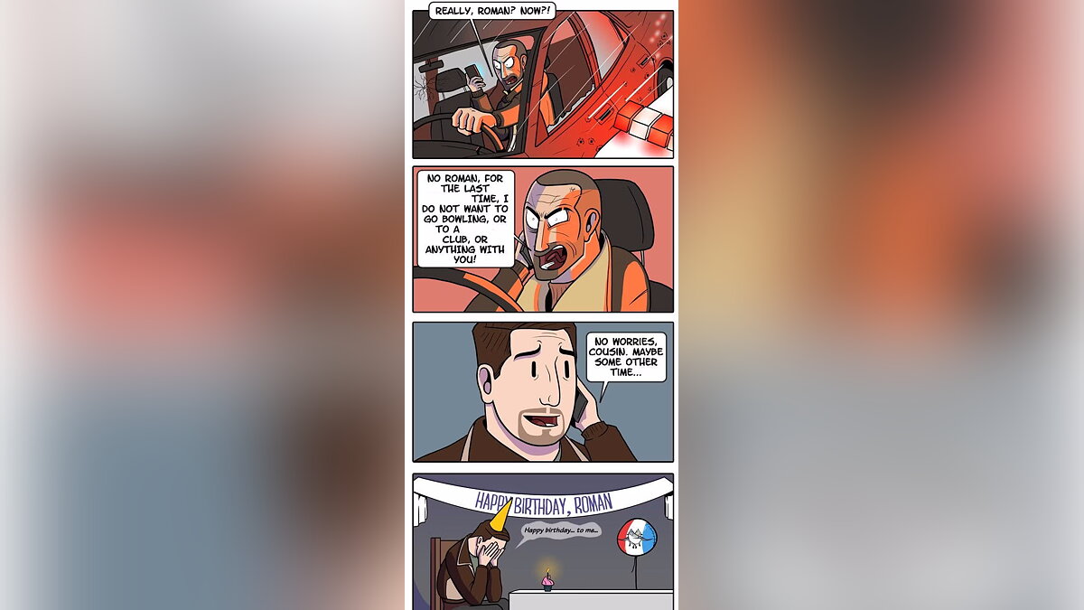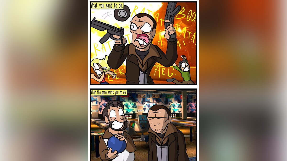Продолжая тему GTA 4, хочется вспомнить назойливого Романа, который постоянно просит сходить поиграть с ним в боулинг. Если поначалу его желание кажется забавным, но ближе к концу прохождения начинает раздражать.