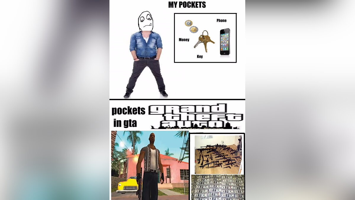 Бездонные карманы — ещё одна условность игр серии GTA. Если в реальности вы носите телефон, ключи и немного денег, то в San Andreas у Си-Джея с собой целый арсенал огнестрельного оружия и миллионы долларов.