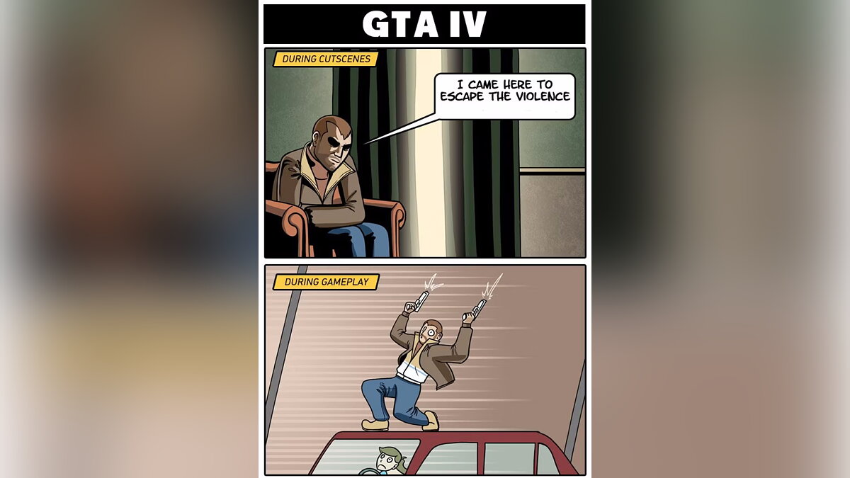 Диссонанс между геймплеем и сюжетом в играх встречается постоянно. Особенно активно за это критикуют серию Uncharted, где весёлый и позитивный главный герой убивает сотни незнакомых ему людей. Но и Нико из GTA 4 хотел лишь расквитаться с одним человеком, который предал его в Сербии. А в итоге ему пришлось перебить множество преступников на своём пути.