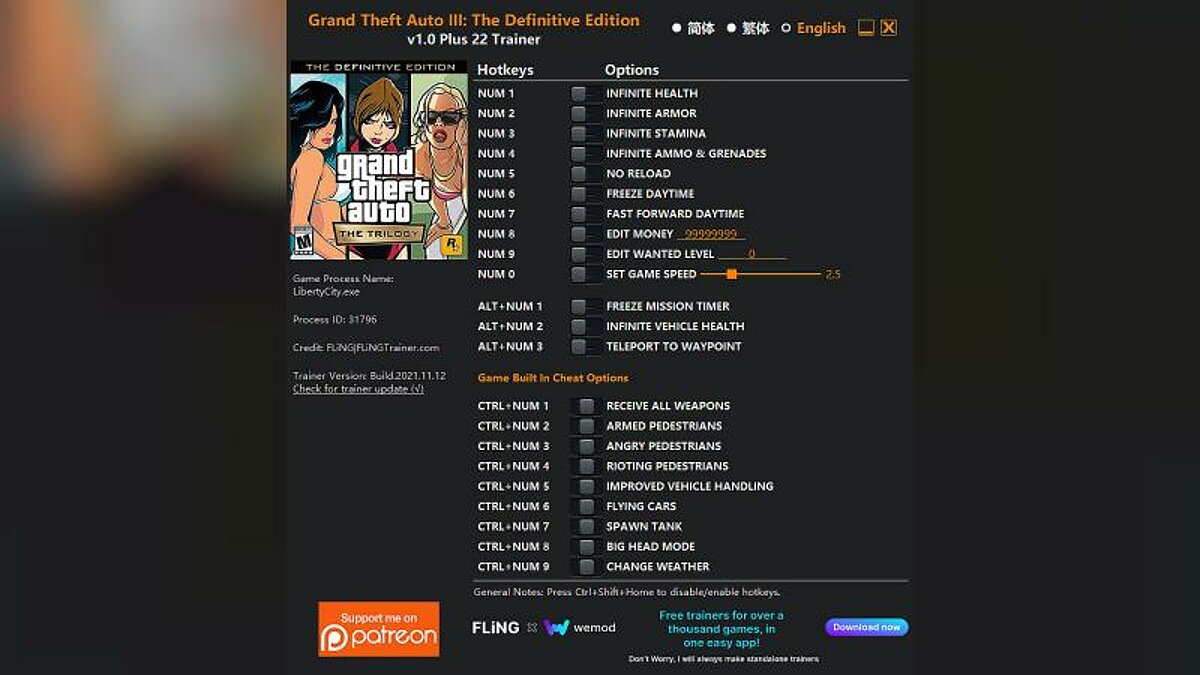 Один из первых трейнеров для GTA: The Trilogy сделал FLiNG. Здесь все по классике: броня, бесконечные патроны, халявные деньги. Из интересного - заморозка таймера миссии. Теперь вертолетик не уничтожит чьи-то нервные клетки.