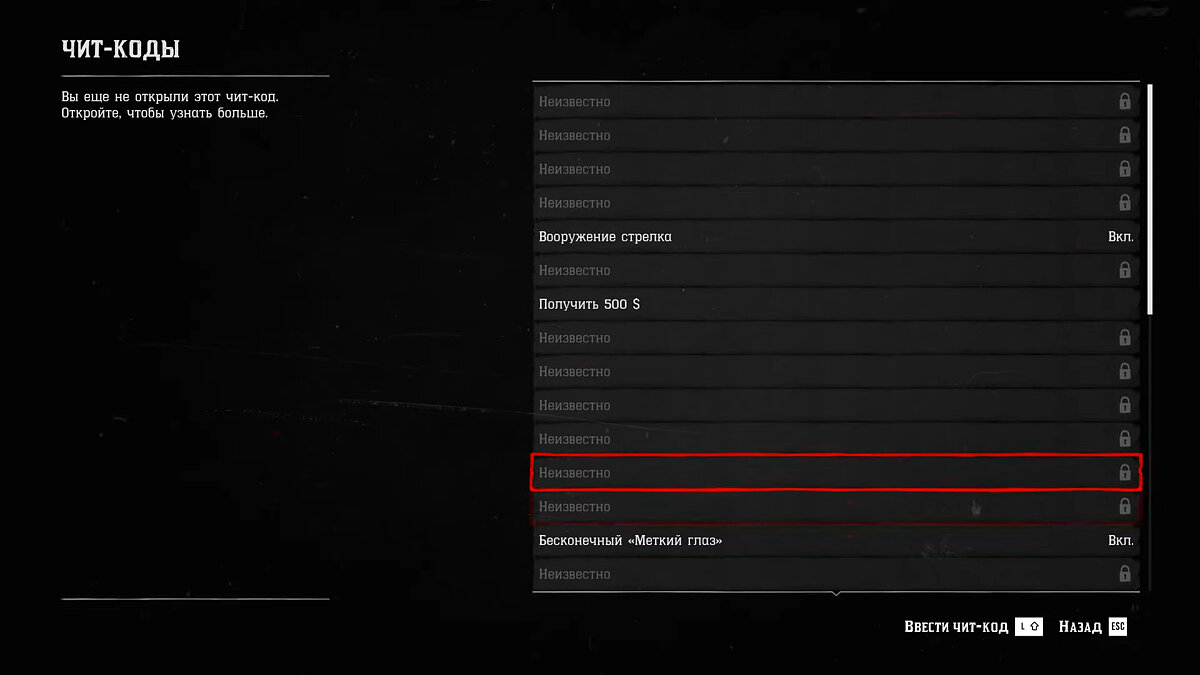 В меню настроек Red Dead Redemption 2 на консолях нажмите «Треугольник» или Y, а на ПК просто зайдите в раздел меню «Коды». Здесь вы можете ввести текст чит-кода. Если вы ввели его правильно, вы получите сообщение «Внимание: вы разблокировали чит-код». После этого чит появится в списке, а вы сможете его включать и отключать в нужное вам время.