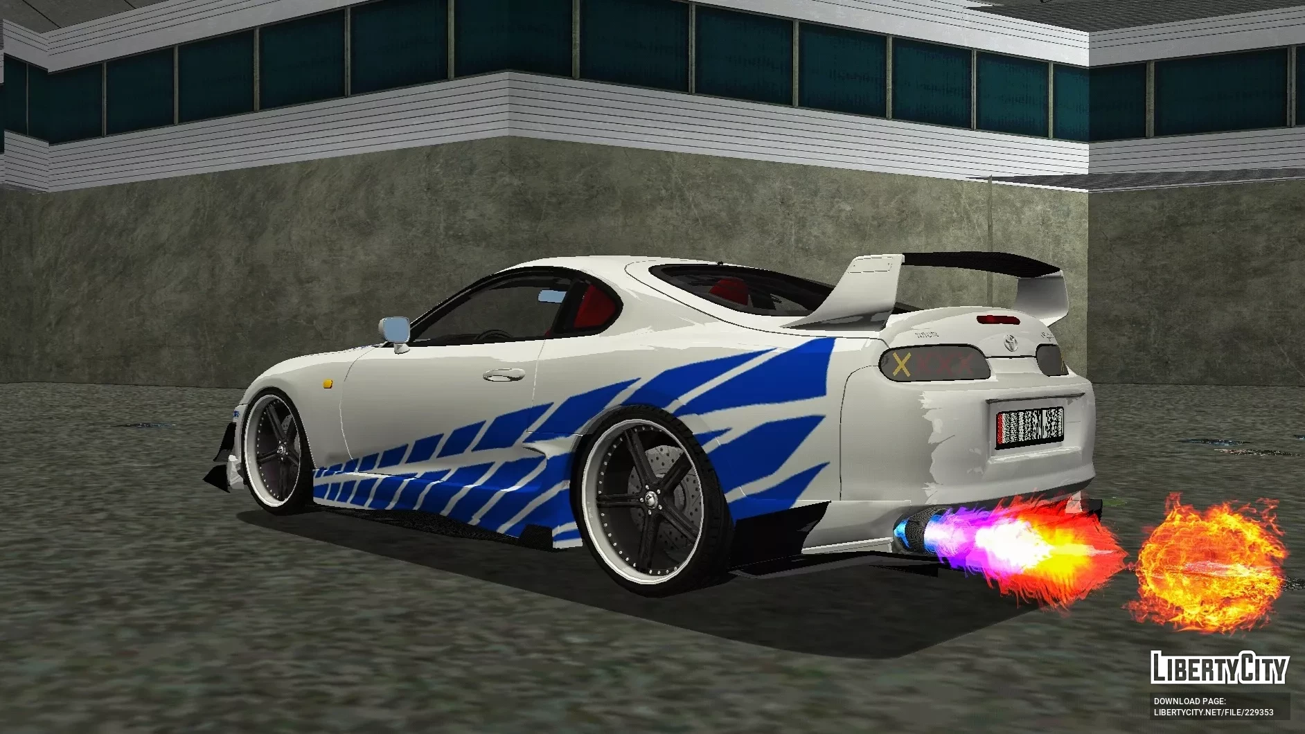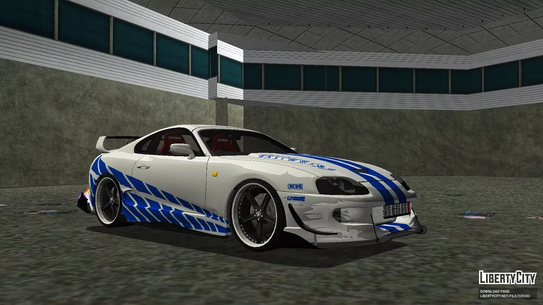 Легендарная Toyota Supra в обвесе и сине-белом виниле, вдохновлённая культовым стилем из фильмов о уличных гонках. Этот автомобиль славится своей высо...