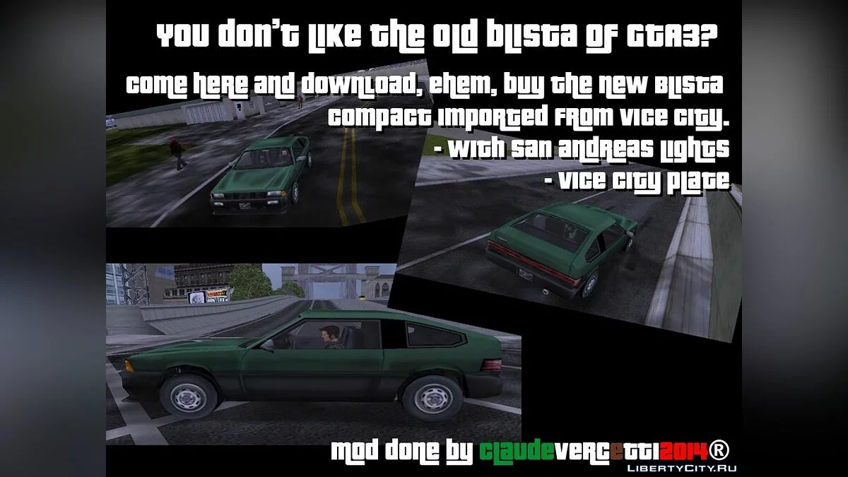 Этот мод заменяет старую Блисту из GTA 3 на её более модифицированную версию. Машина сконвертирована из GTA Vice City, номерные знаки остались прежними, а фары и некотрые текстуры перекочевали прямиком из Сан-Андреаса....