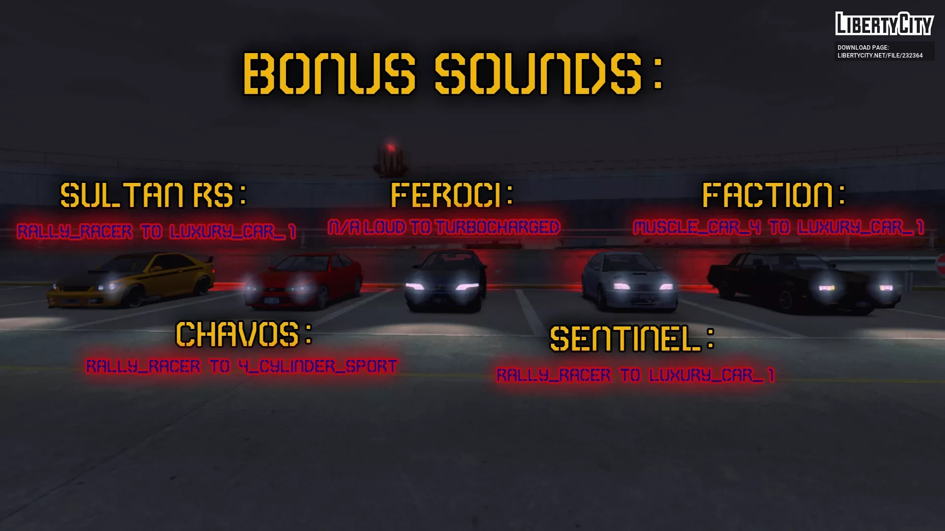 Всегда не удавалось найти подходящие звуки для тюнингованных автомобилей или звуки 6-цилиндровых двигателей, которые не сосредоточены только на замене звука двигателя Subaru Boxer (RALLY_RACER) из Sultan & Sentinel?