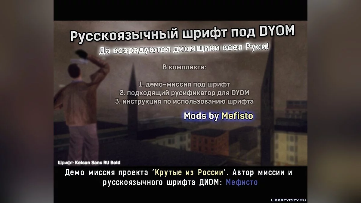 Свершилось! Да возрадуются все диомщики России! Теперь с этого дня нам не придется писать ZOTPA4EHHSM шрифтом в DYOM'e! Этот русификатор позволяет писать нормальными русскими буквами ! Причем он работает почти без багов и вылетов ! Буквы в высок...