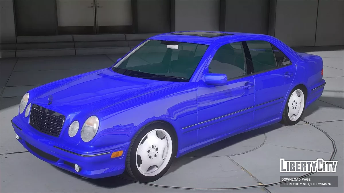 Mercedes-Benz E55 AMG (W210) для GTA 5. Передняя часть автомобиля характеризуется большими круглыми фарами с интегрированными противотуманными фарами. Решетка радиатора имеет спортивный вид, с хромированной окантовкой и серебристыми вертикальными по...