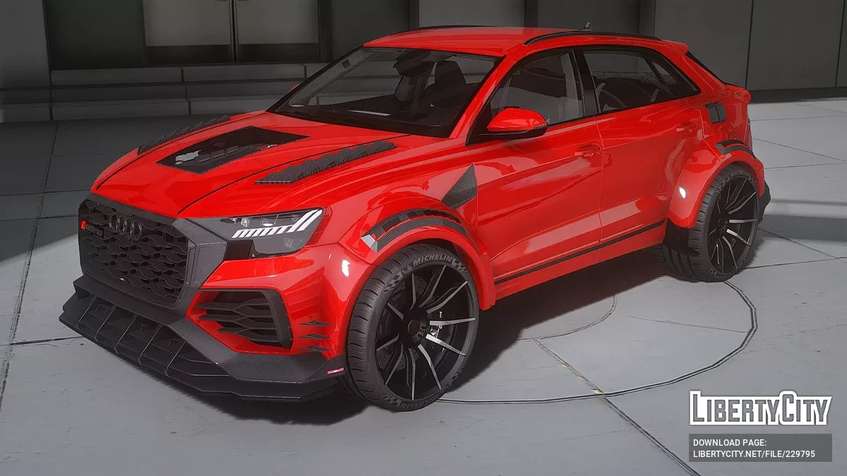Audi RS Q8 для GTA 5. Передняя часть: Капот с выразительными вентиляционными прорезями и карбоновыми вставками подчёркивает спортивный и агрессивный характер кроссовера. Фирменная чёрная решётка радиатора Singleframe с логотипом Audi и шильдиком...