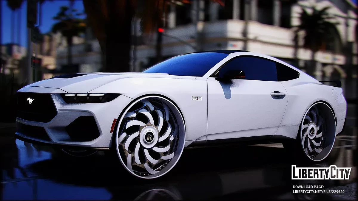 2024 Ford Mustang GT для GTA 5. 2024 Ford Mustang GT – это спортивный автомобиль с привлекательным и агрессивным дизайном. Он имеет широкий капот с воздухозаборниками, мощный бампер с интегрированными противотуманными фарами и острые линии кузова, ...