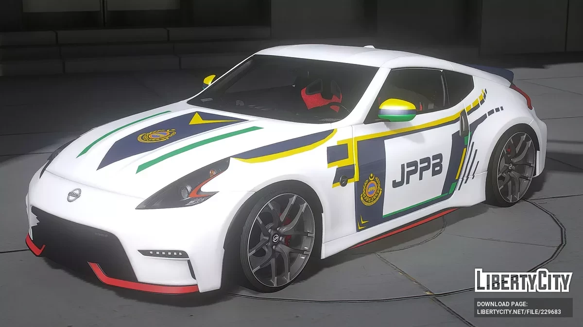 Nissan 370Z Nismo для GTA 5. Передняя часть: Капот украшен крупной синей вставкой с эмблемой и жёлтыми, зелёными акцентами, что подчёркивает уникальный стиль автомобиля и его принадлежность к служебным или полицейским машинам. Фары выполнены в к...