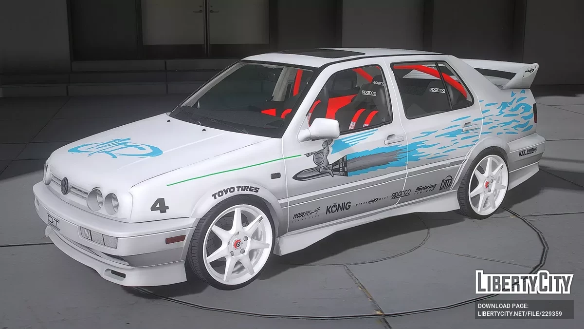 Volkswagen Jetta The Fast and the Furious для GTA 5. Передняя часть: Капот окрашен в белый цвет и украшен крупным голубым графическим элементом, что подчёркивает индивидуальность автомобиля. Фирменная решётка радиатора Volkswagen без изменений, ...