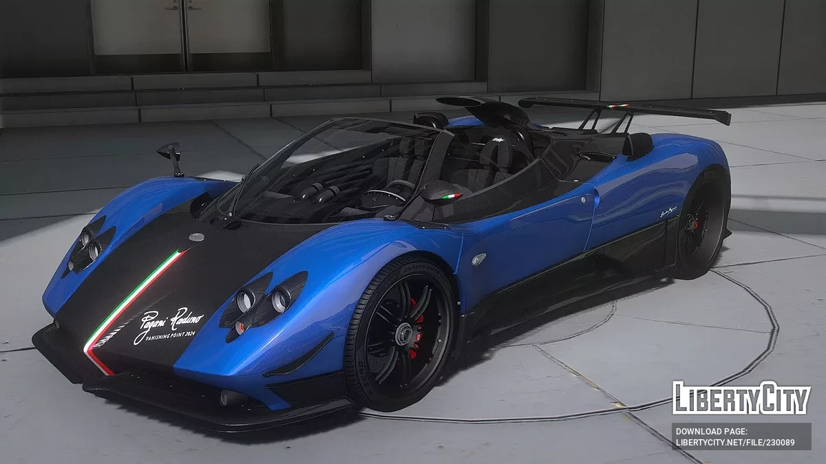 Pagani Zonda Cinque Roadster для GTA 5. Передняя часть: Капот выполнен из матового карбона с центральной полосой в цветах итальянского флага, что подчёркивает происхождение и эксклюзивность автомобиля. Фирменная надпись "Pagani Roadster&quo...