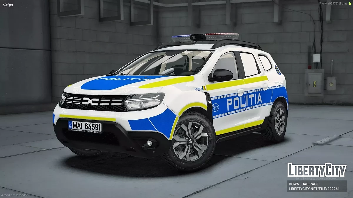 2023 Dacia Duster Politie Romana для GTA 5. Dacia Duster 2023 года, используемая румынской полицией, имеет яркий и современный дизайн. Автомобиль окрашен в белый цвет с синими и жёлтыми акцентами. На капоте и боках крупно нанесена надпись "POLITIA"...