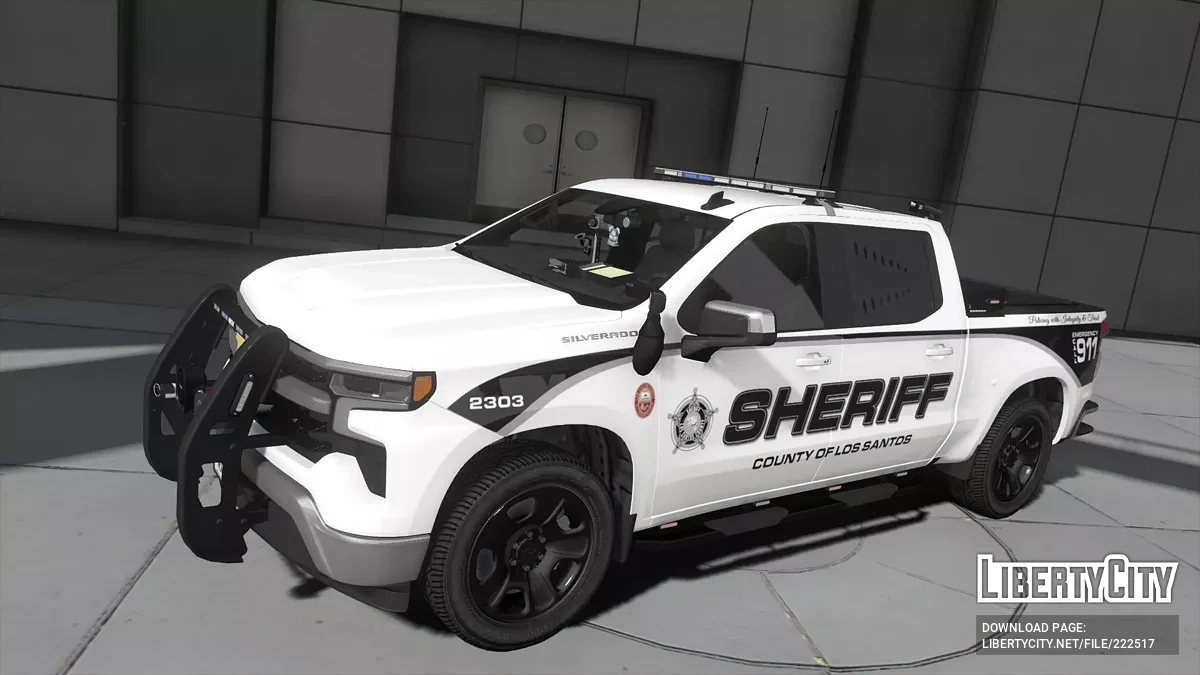 2023 Chevrolet Silverado для GTA 5. 2023 Chevrolet Silverado представлен как полицейский пикап. Он окрашен в белый цвет с черными элементами и имеет надписи "SHERIFF" и "COUNTY OF LOS SANTOS" на боках. На крыше установлены световые маячки и антенны...