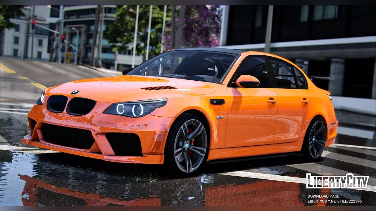 BMW M5 E60 для GTA 5. Передняя часть автомобиля оснащена характерной решеткой радиатора и агрессивными воздухозаборниками. Светодиодные фары с кольцевыми элементами добавляют современности и стиля. Задняя часть автомобиля украшена стильным спой...