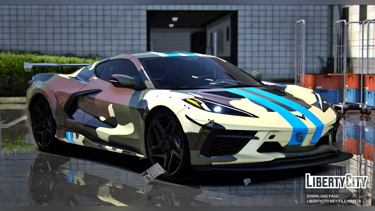 Chevrolet Corvette C8 Dolph для GTA 5. Chevrolet Corvette C8 Dolph выделяется своим уникальным и смелым дизайном. Кузов автомобиля украшен камуфляжной окраской с преобладанием светлых и темных оттенков, создавая впечатляющий визуальный эффект. Ярко...