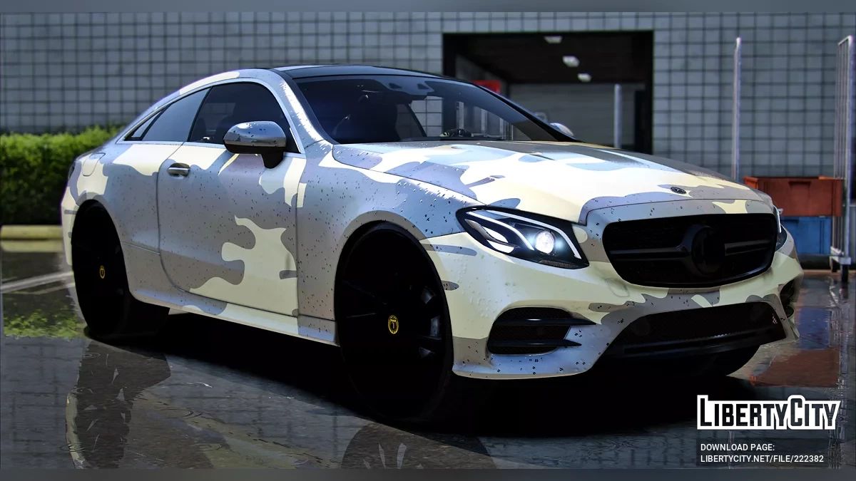 Mercedes-Benz E400 4MATIC для GTA 5. Передняя часть: Автомобиль выделяется выразительной решеткой радиатора с крупной эмблемой Mercedes-Benz в центре. Фары имеют характерную форму и оснащены LED-технологией, что придаёт машине современный и агрес...