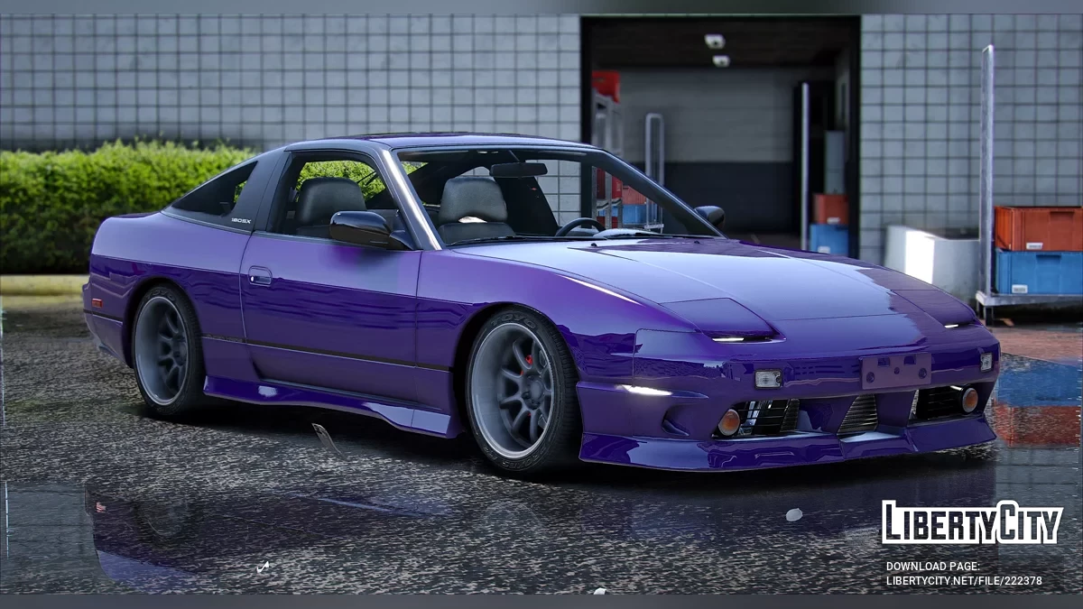 Nissan 180SX для GTA 5. Передняя часть автомобиля оснащена характерными выдвижными фарами, которые подчеркивают его ретро-стиль. Низкий передний бампер и аэродинамические элементы добавляют агрессивности и спортивного характера. Задняя часть ав...