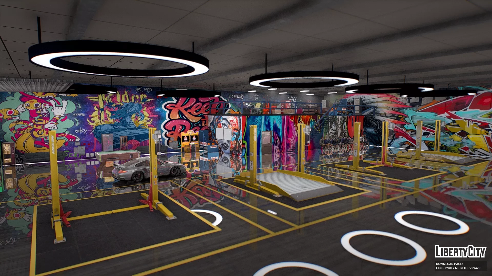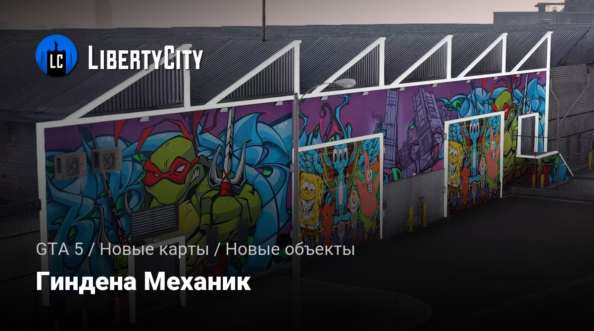 Внешний вид Gindena Mechanic представляет собой большое промышленное здание с серой металлической крышей и кирпичными стенами. Главная особенность фасада — яркое и масштабное граффити, покрывающее всю переднюю стену. На граффити изображены известные персонажи поп-культуры: Черепашка-ниндзя с красной повязкой, Спанч Боб, Патрик, Кот из мультфильмов и другие мультяшные герои. Картина выполнена в насыщенных, контрастных цветах, что делает здание очень заметным и узнаваемым. Контуры здания и дверей выделены белыми светящимися линиями, что добавляет современный и стильный акцент. В целом, внешний вид мастерской выглядит креативно, молодежно и привлекает внимание благодаря своему уникальному оформлению.