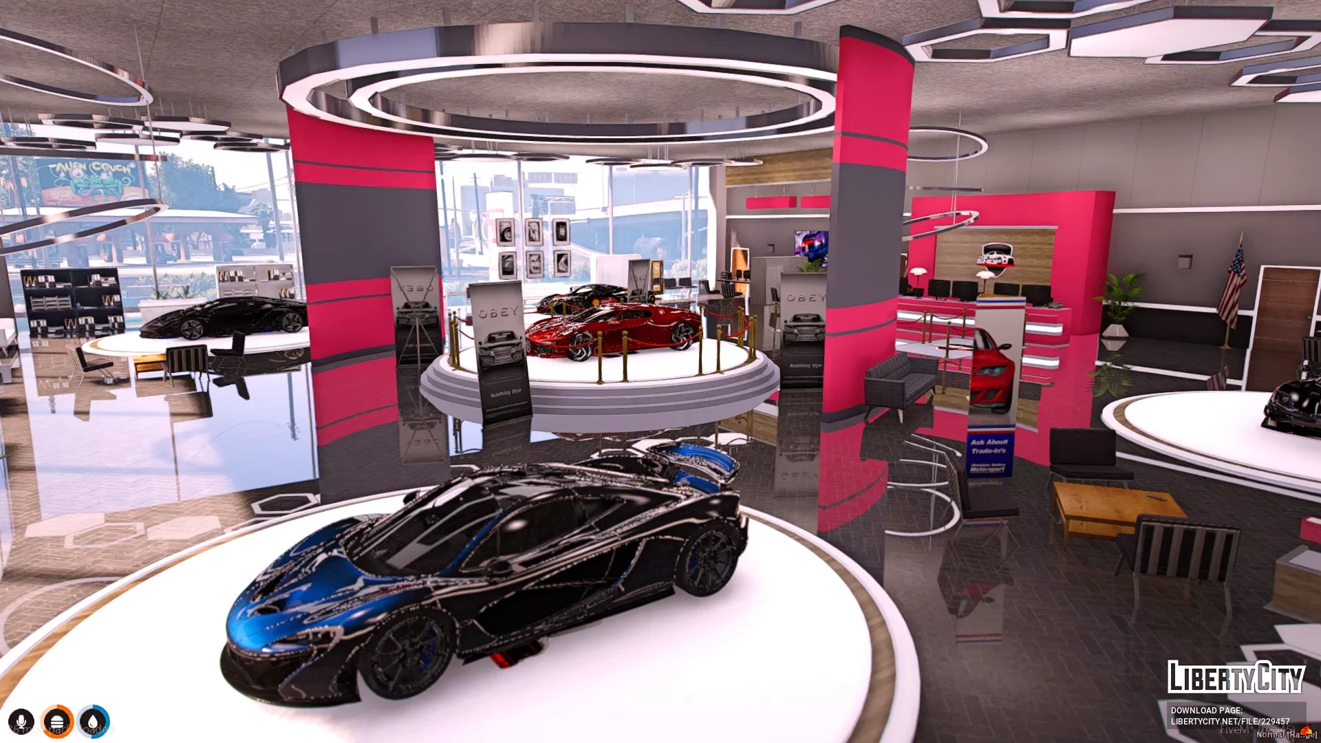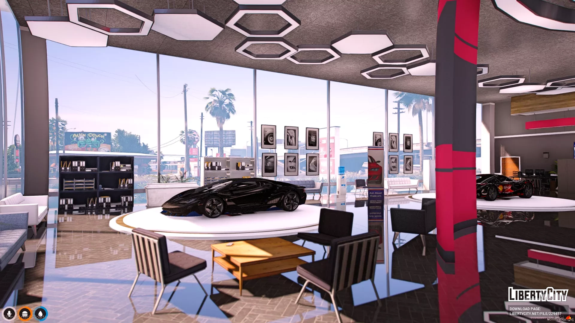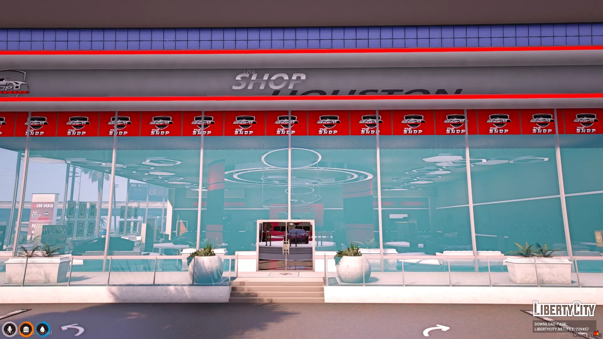 Автосалон представляет собой современное здание квадратной формы с плоской крышей. Фасад выполнен из стеклянных панелей, что придаёт зданию стильный и презентабельный вид. Вдоль верхней части фасада проходят красные и синие декоративные полосы, подчёркивающие фирменный стиль. Перед входом в автосалон находится аккуратная зелёная лужайка с кустарниками, пальмами и небольшими клумбами. Также на территории есть парковка для клиентов и флагшток с американским флагом. Здание расположено на пересечении оживлённых улиц, окружено дорогами и магистралями, что делает его легко доступным для посетителей.