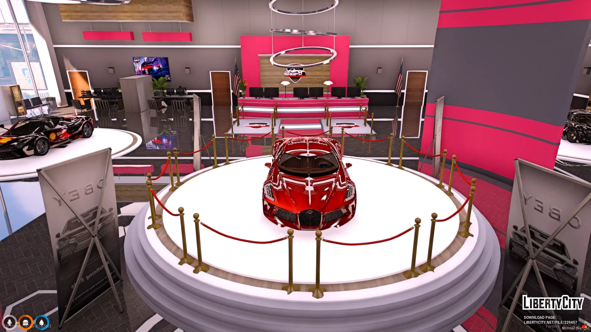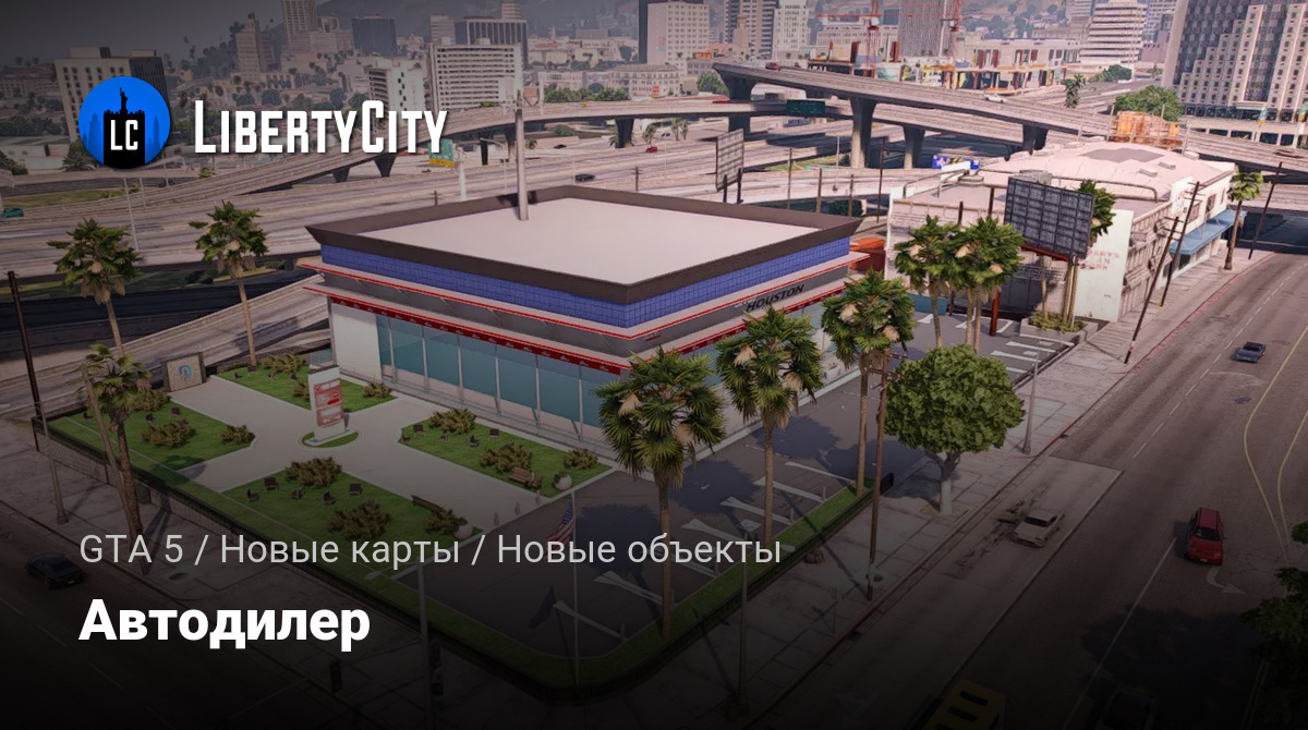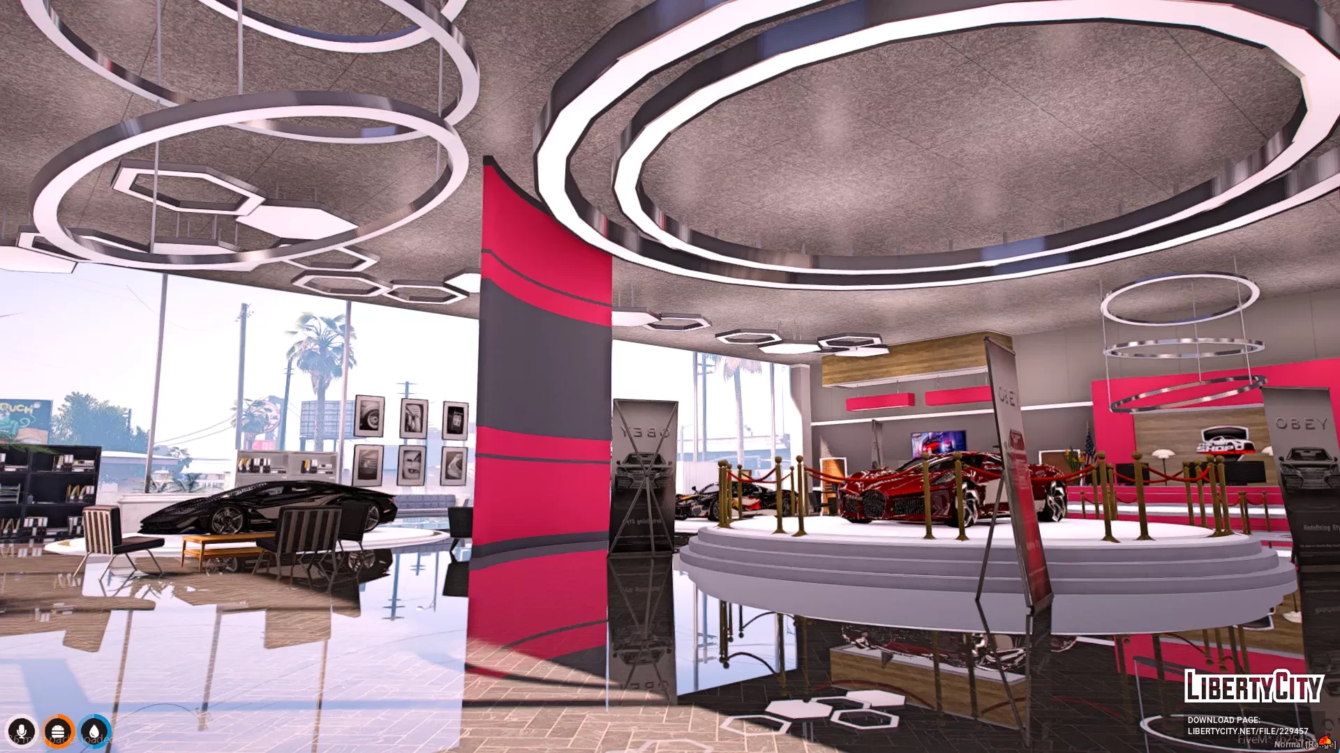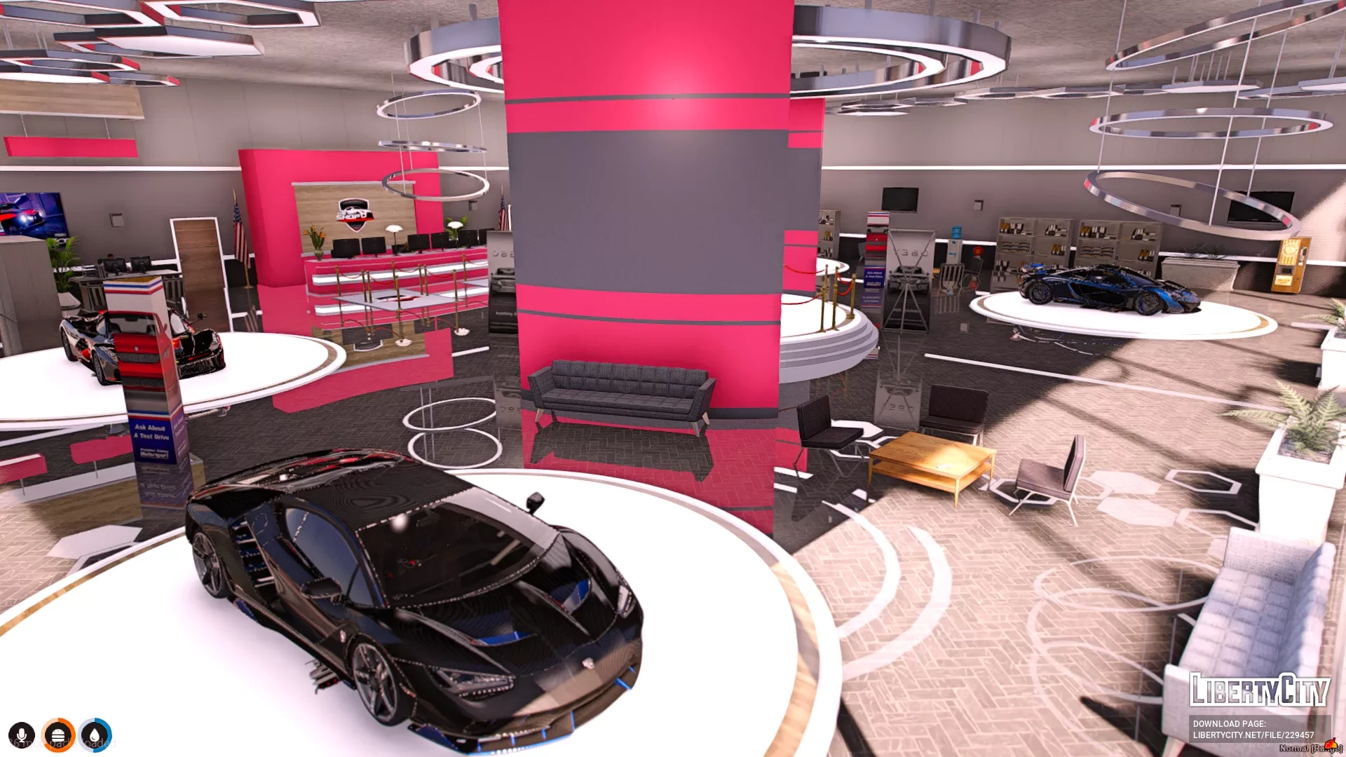 Автосалон представляет собой современное здание квадратной формы с плоской крышей. Фасад выполнен из стеклянных панелей, что придаёт зданию стильный и презентабельный вид. Вдоль верхней части фасада проходят красные и синие декоративные полосы, подчёркивающие фирменный стиль. Перед входом в автосалон находится аккуратная зелёная лужайка с кустарниками, пальмами и небольшими клумбами. Также на территории есть парковка для клиентов и флагшток с американским флагом. Здание расположено на пересечении оживлённых улиц, окружено дорогами и магистралями, что делает его легко доступным для посетителей.