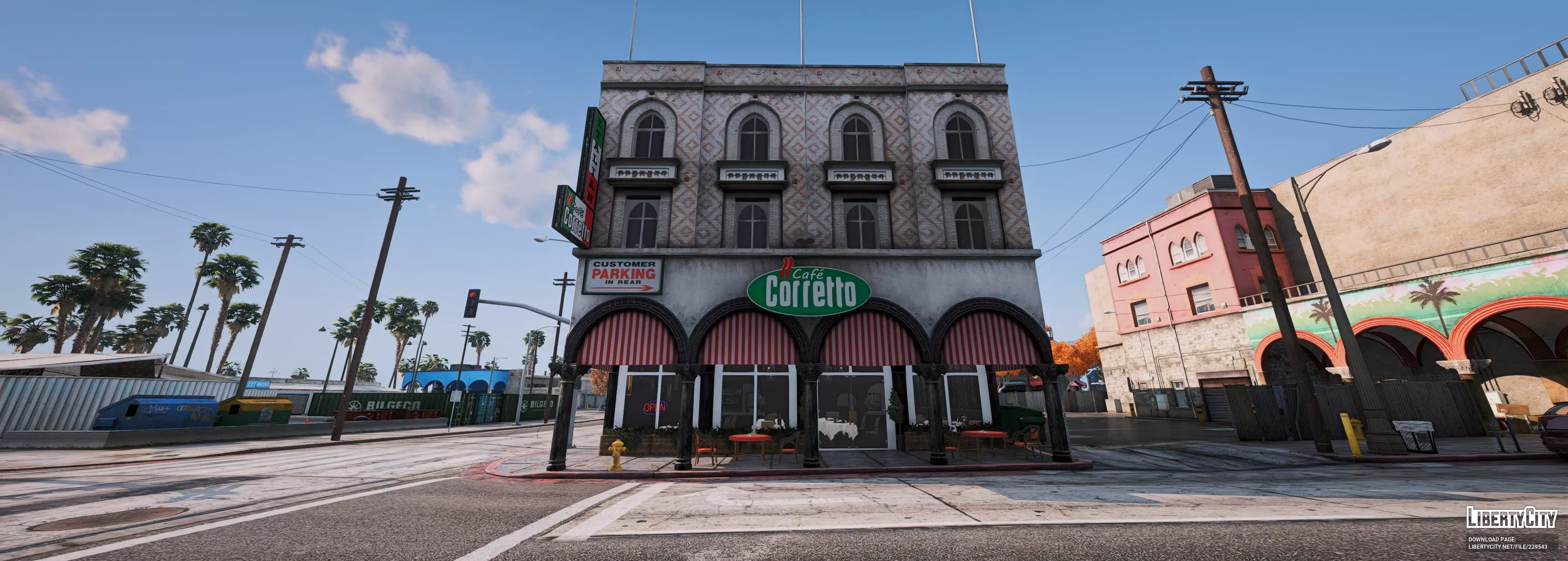 Кафе Coretto располагается в трёхэтажном здании с классическим европейским фасадом. Верхние этажи украшены арочными окнами с декоративными балконами, а сам фасад отделан светлой плиткой с геометрическим узором. На первом этаже расположены большие витринные окна, через которые виден интерьер кафе. Над входом установлена зелёная вывеска с названием "Café Coretto", а окна украшены красно-чёрными полосатыми маркизами. Перед кафе стоят небольшие круглые столики с красными стульями, создавая уютную атмосферу для посетителей. Сбоку здания можно увидеть вывеску с указанием парковки для клиентов. Общий стиль заведения напоминает итальянские уличные кафе, подчёркивая его аутентичность и гостеприимство.