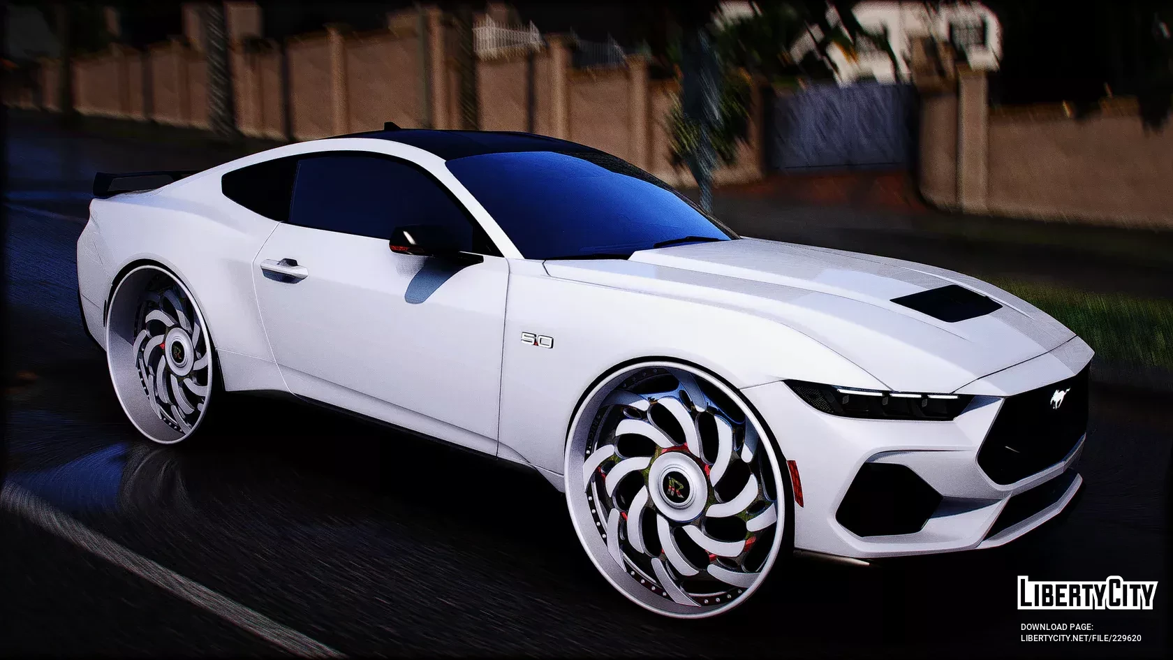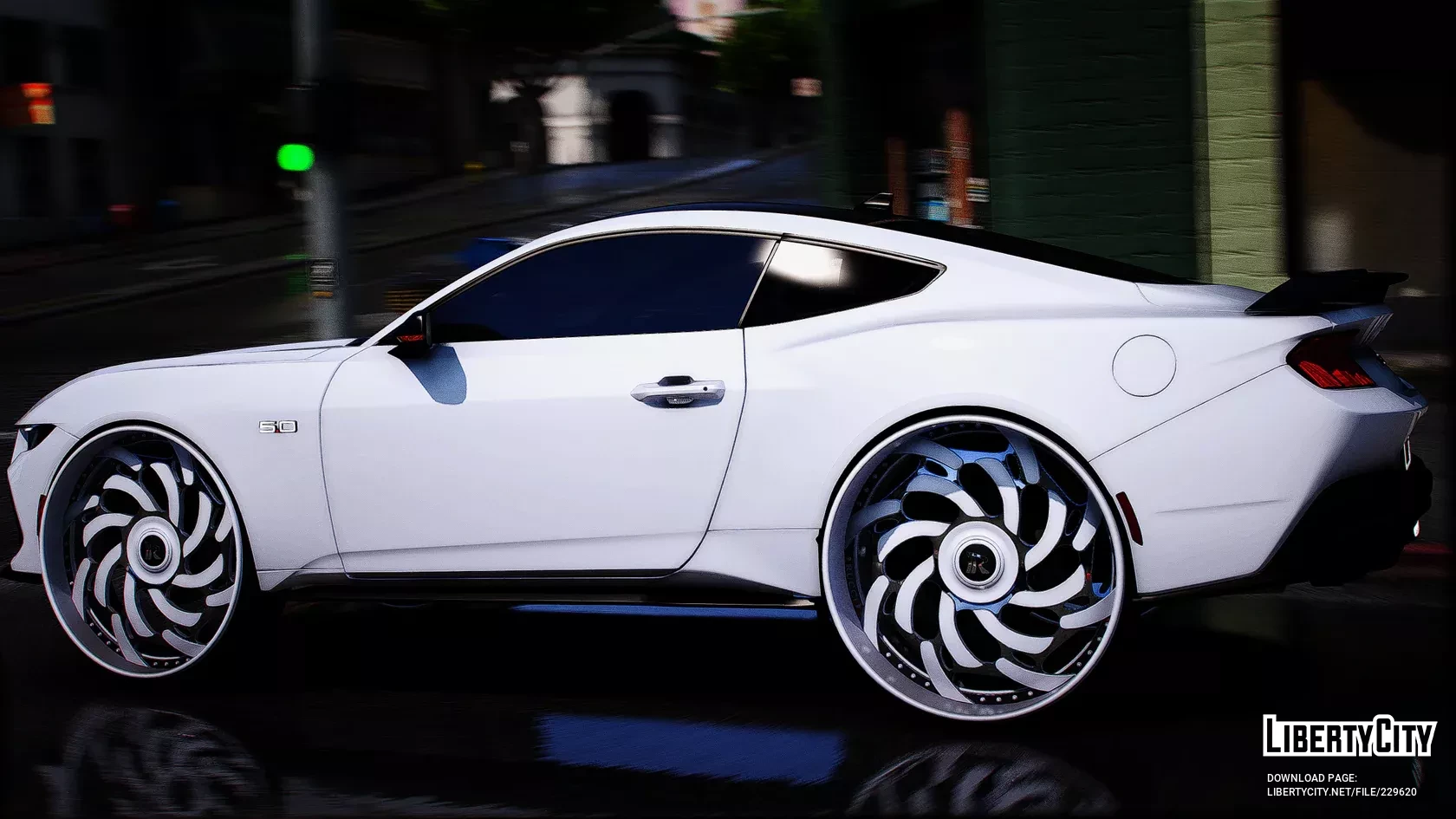 2024 Ford Mustang GT для GTA 5. 2024 Ford Mustang GT – это спортивный автомобиль с привлекательным и агрессивным дизайном. Он имеет широкий капот с воздухозаборниками, мощный бампер с интегрированными противотуманными фарами и острые линии кузова, ...