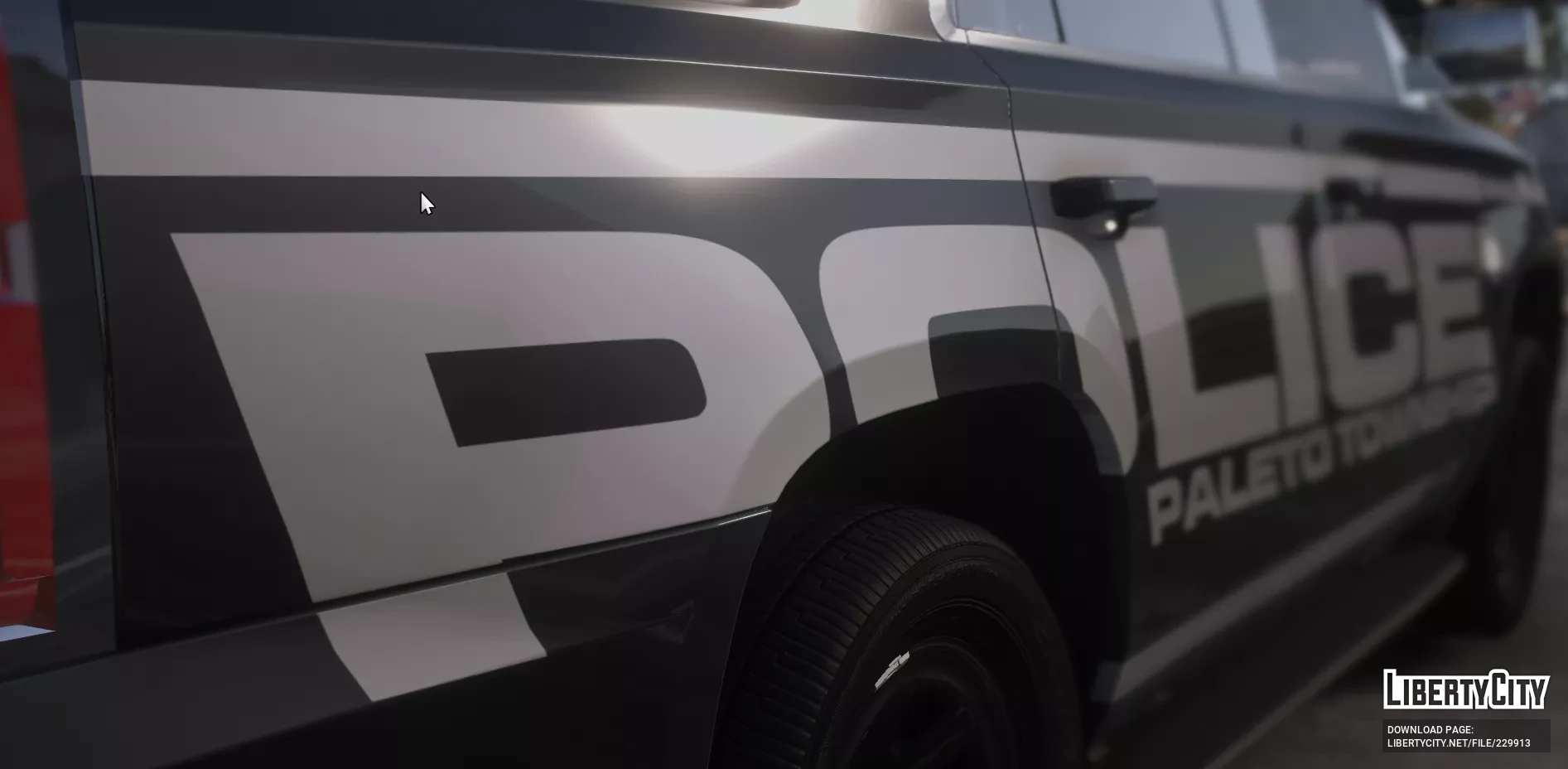 - Кузов окрашен в благородный чёрный цвет с крупными серыми надписями "POLICE" и "PALETO TOWNSHIP" по всей длине.