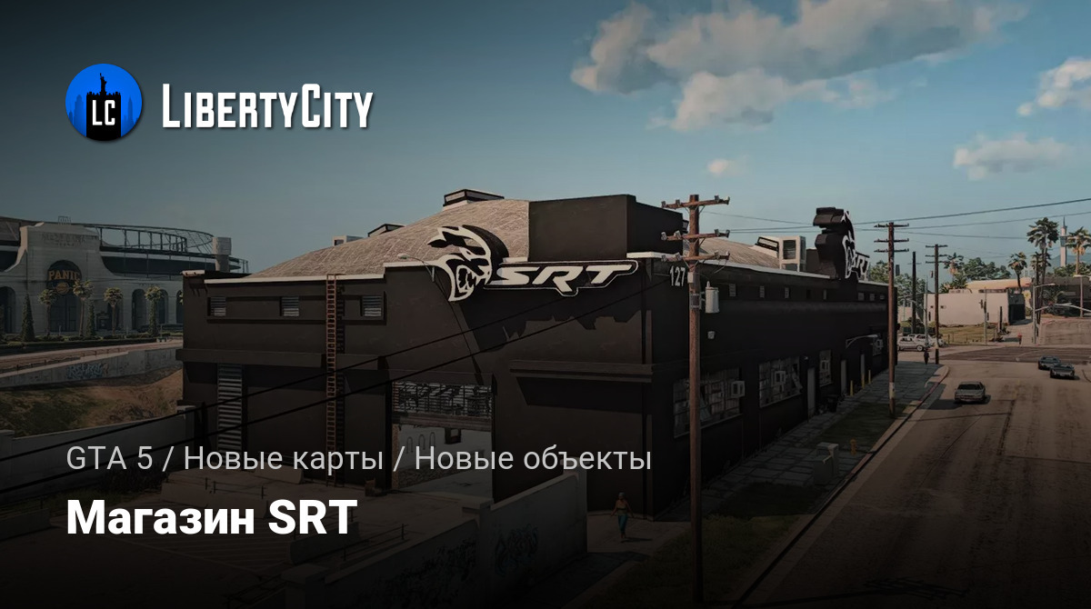 Здание автомастерской SRT выполнено в современном индустриальном стиле. Его фасад окрашен в глубокий чёрный цвет, что придаёт сооружению строгий и стильный вид. На крыше и боковой стене крупно размещён логотип SRT с изображением головы хищника и белыми буквами, что сразу выделяет мастерскую среди окружающих построек. На стенах присутствуют небольшие окна и вентиляционные решётки, а также пожарные лестницы. Входная зона оборудована просторными воротами для заезда автомобилей, а рядом располагается небольшая парковка с граффити на бетонном заборе. Здание находится на углу улицы, что обеспечивает удобный подъезд с двух сторон.