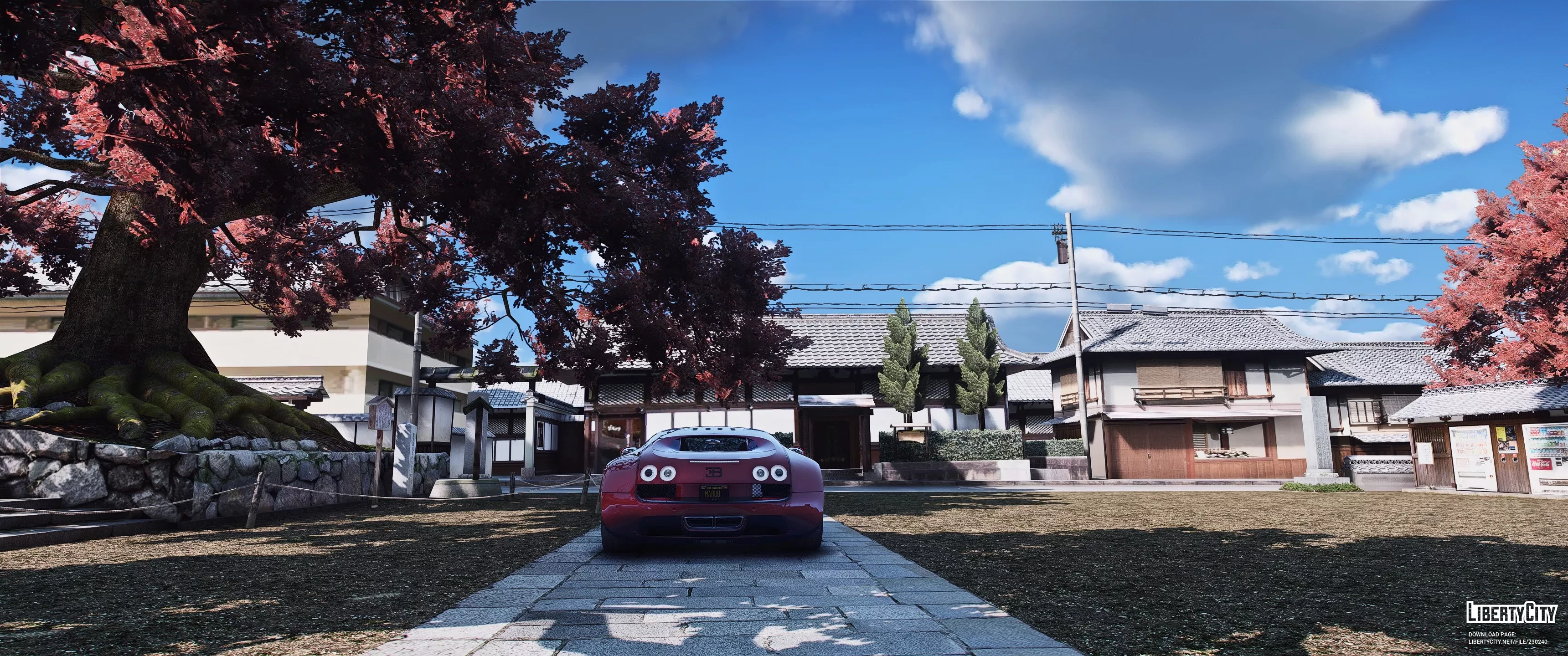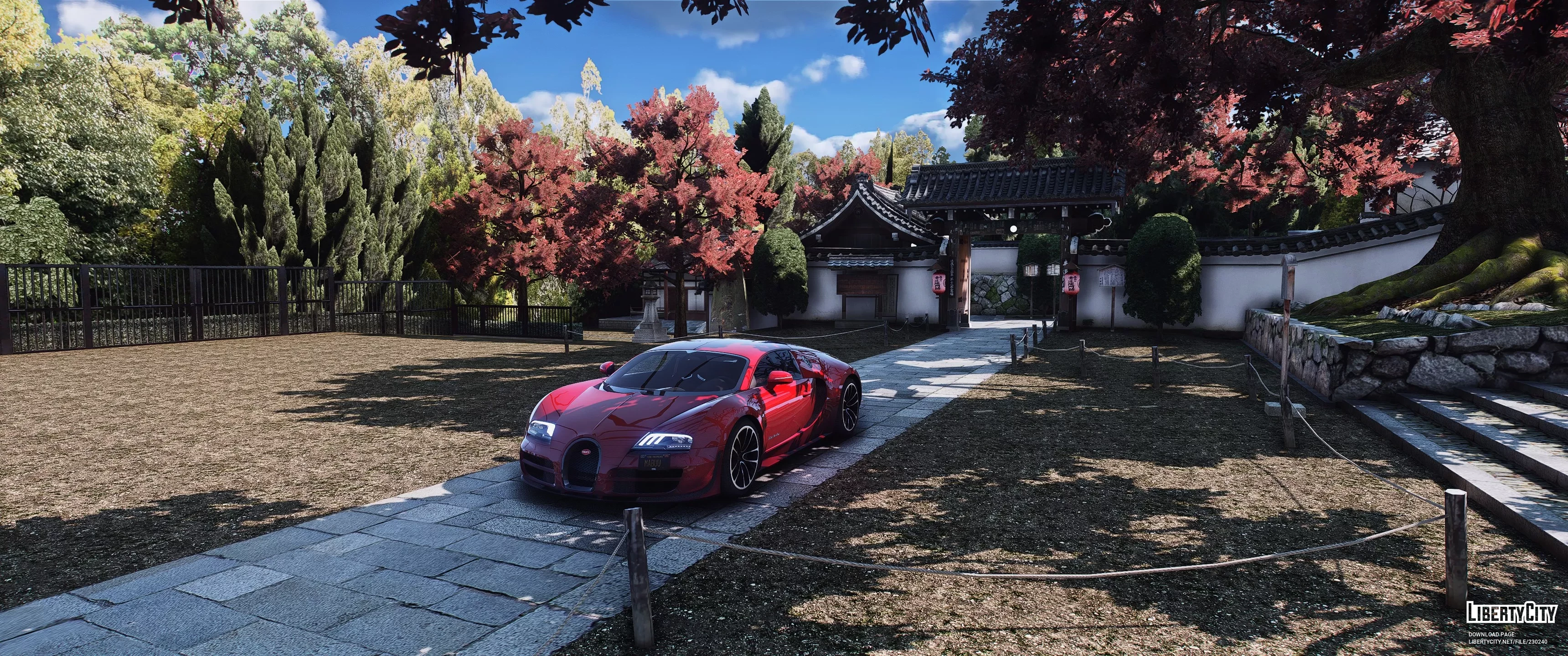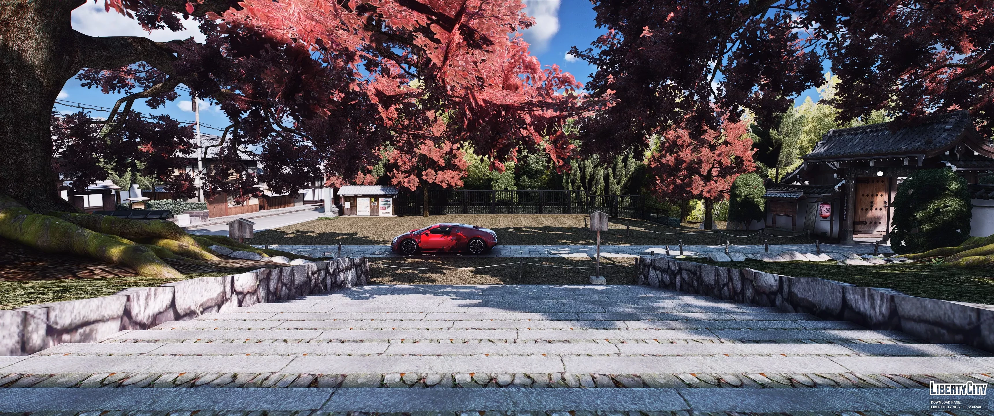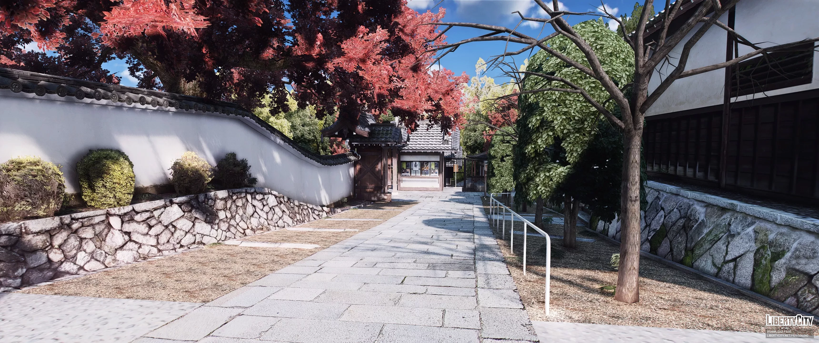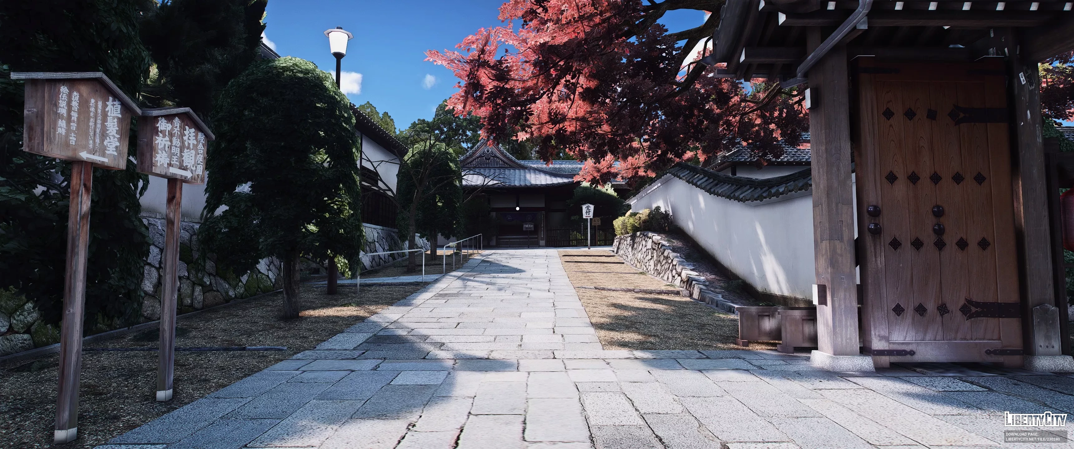 Shorenin — это традиционный японский храмовый комплекс, окружённый живописной природой. Комплекс состоит из нескольких зданий с характерной японской архитектурой: белые стены, тёмные деревянные крыши с изогнутыми краями и массивные ворота. Вокруг храма растут красивые деревья с алыми листьями, создавая атмосферу уюта и гармонии. Главная дорожка, вымощенная камнем, ведёт к центральному входу. На территории также видны ухоженные кусты, каменные ограды и традиционные японские фонари. Всё пространство выглядит ухоженным и умиротворённым, подчёркивая атмосферу покоя и традиций.