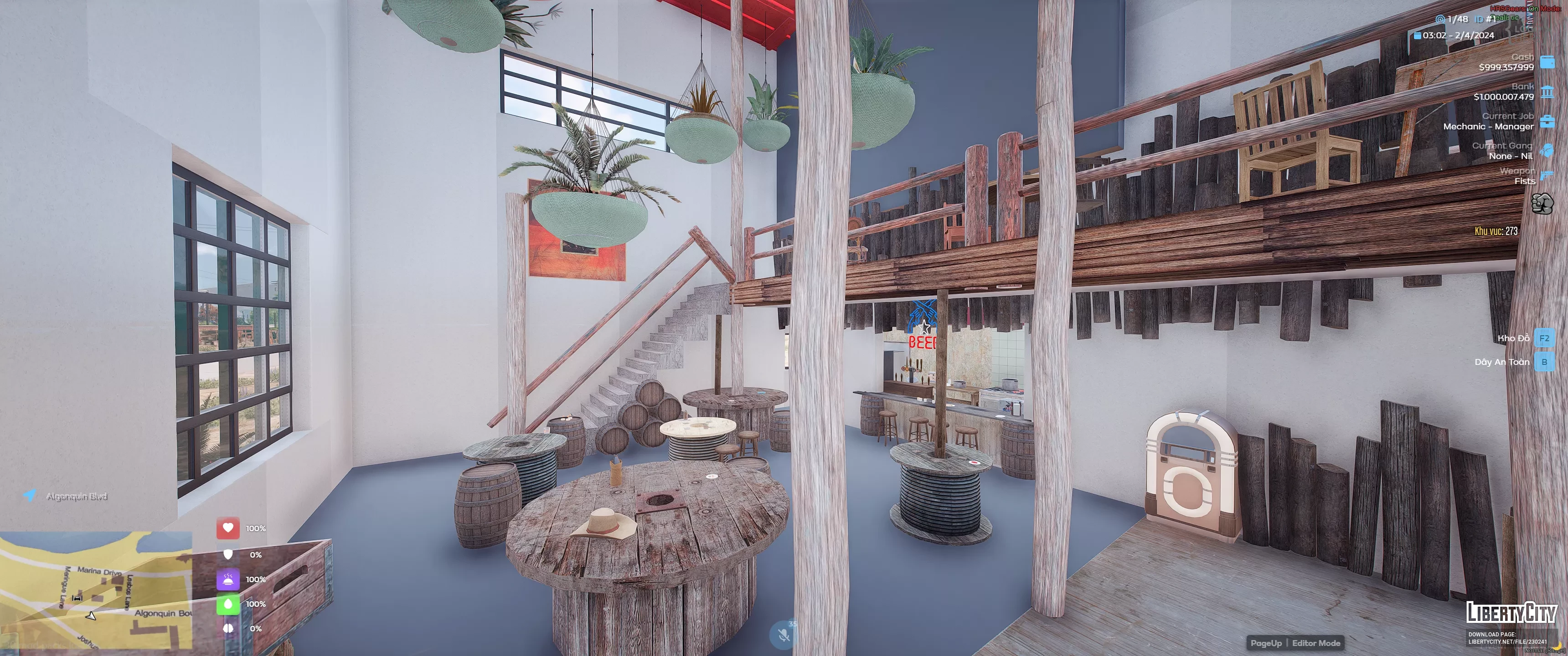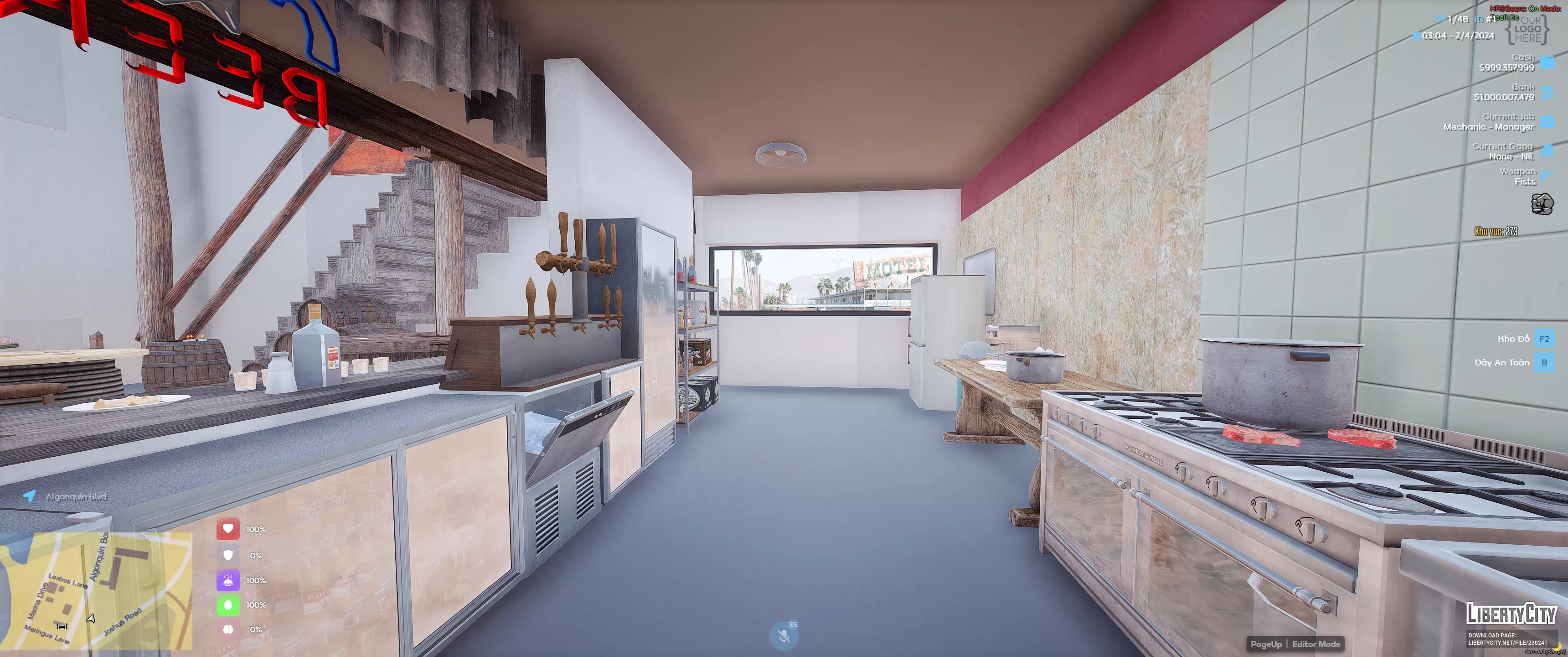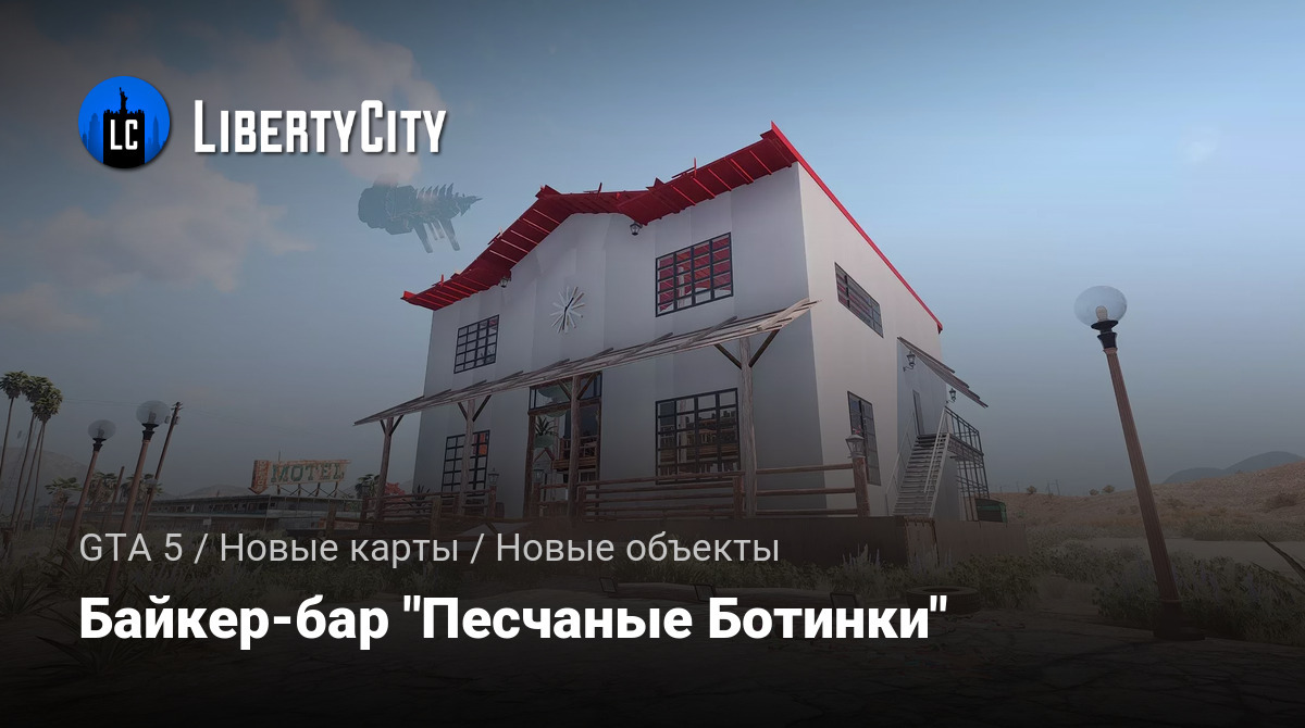 Biker Bar Sandy Shoes — это двухэтажное здание с белыми стенами и яркой красной крышей, расположенное в пустынной местности. Фасад украшен большими черными окнами с металлическими решетками, а над главным входом находится простая деревянная веранда с навесом. К зданию ведет лестница сбоку, а вокруг растет сухая трава и кустарники, что подчеркивает атмосферу запущенности и уединенности. Перед баром установлены уличные фонари с круглыми плафонами, некоторые из которых слегка наклонены. Вдали виднеется вывеска мотеля, а вокруг простирается типичный пустынный ландшафт с пальмами и редкой растительностью.