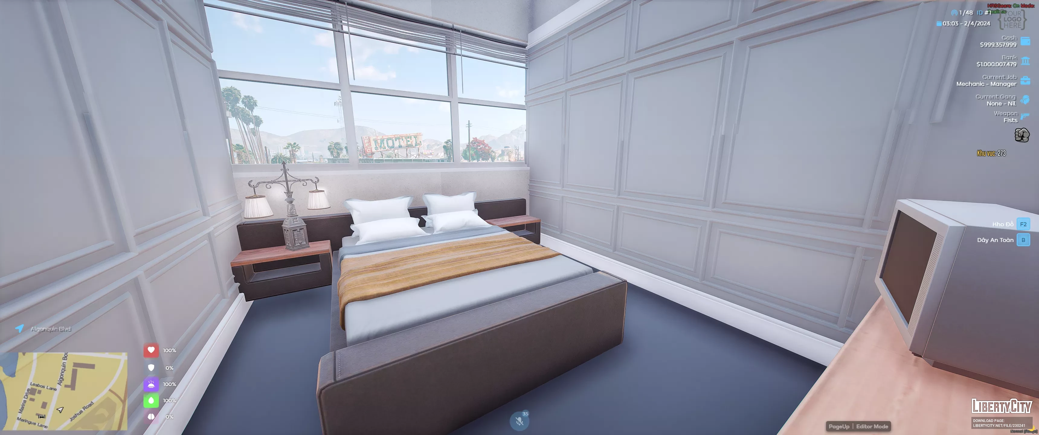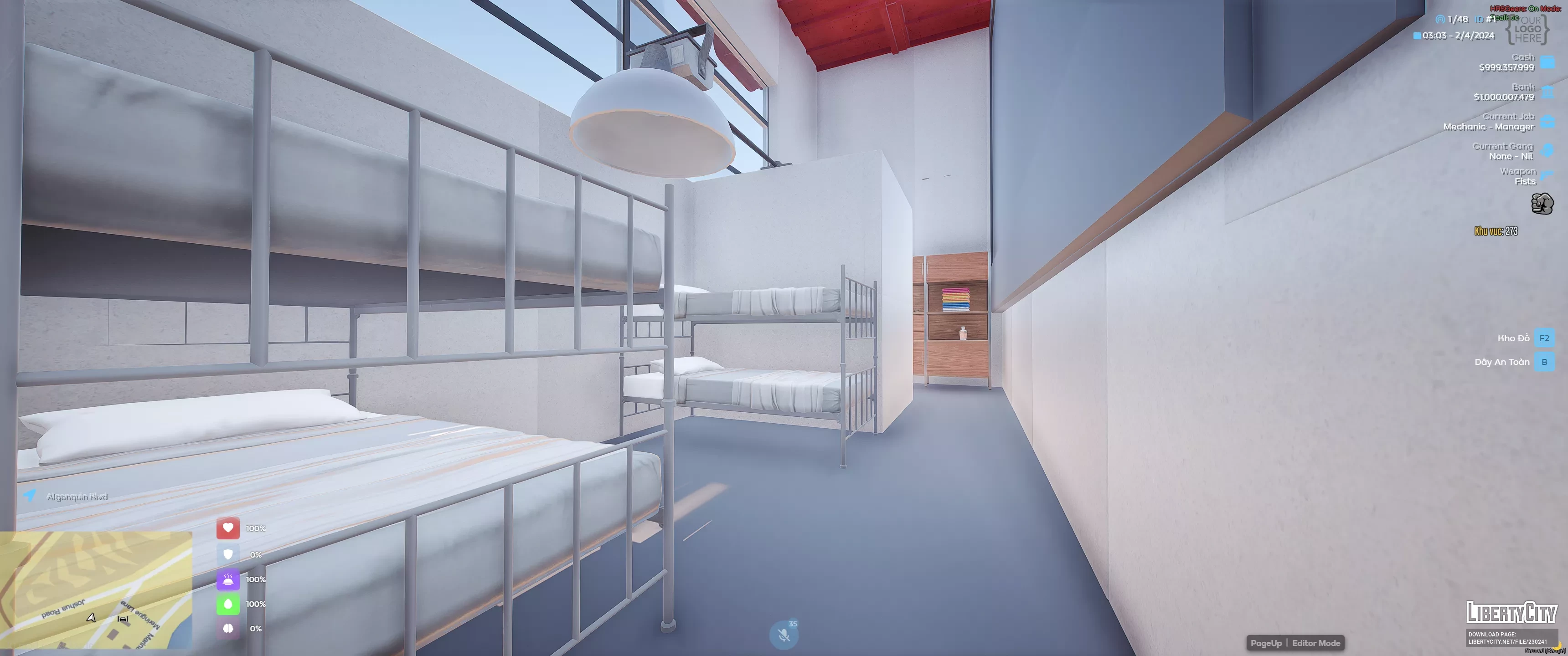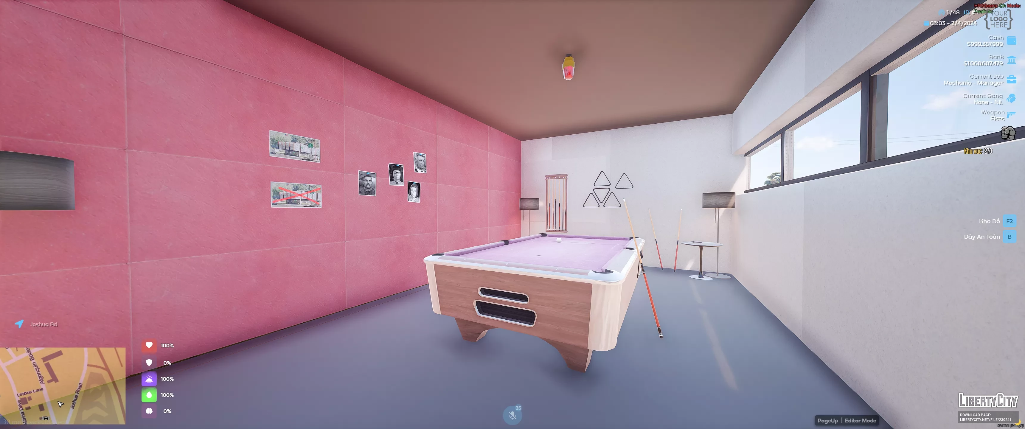 Biker Bar Sandy Shoes — это двухэтажное здание с белыми стенами и яркой красной крышей, расположенное в пустынной местности. Фасад украшен большими черными окнами с металлическими решетками, а над главным входом находится простая деревянная веранда с навесом. К зданию ведет лестница сбоку, а вокруг растет сухая трава и кустарники, что подчеркивает атмосферу запущенности и уединенности. Перед баром установлены уличные фонари с круглыми плафонами, некоторые из которых слегка наклонены. Вдали виднеется вывеска мотеля, а вокруг простирается типичный пустынный ландшафт с пальмами и редкой растительностью.