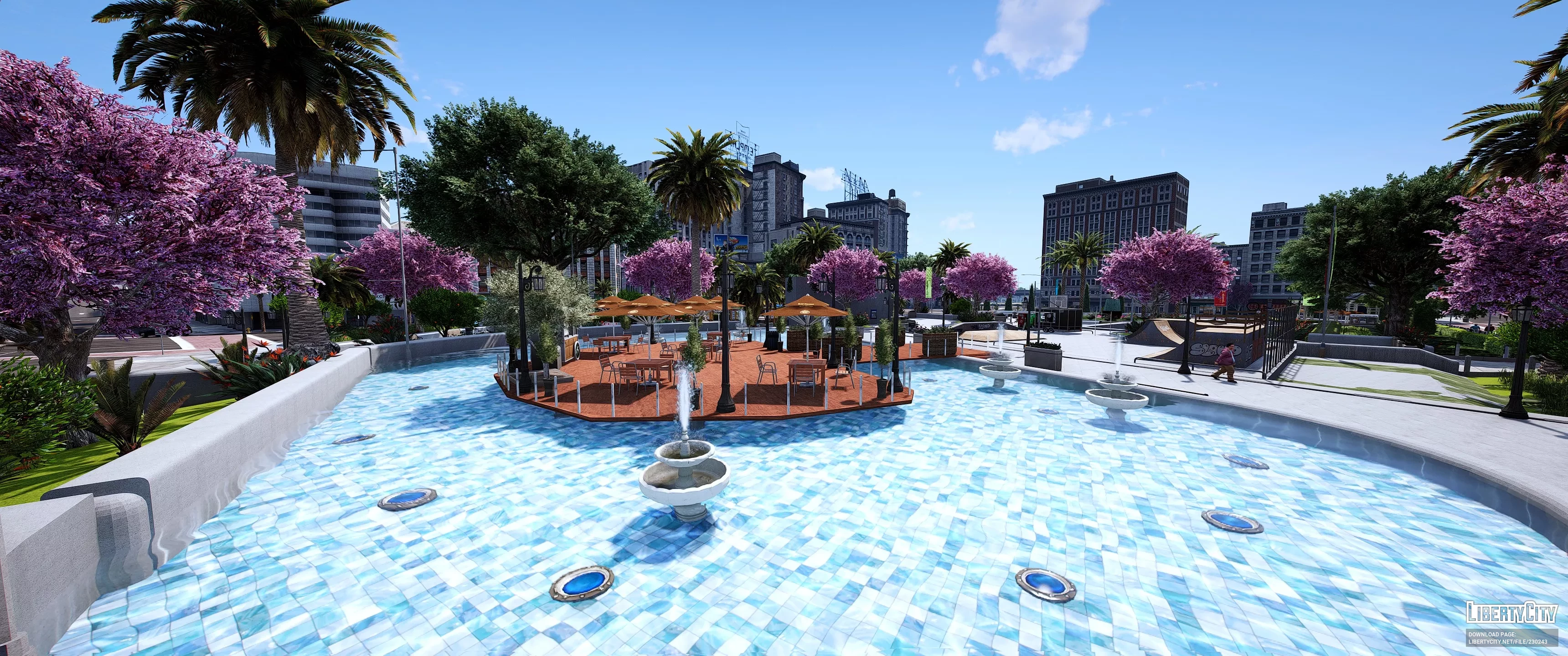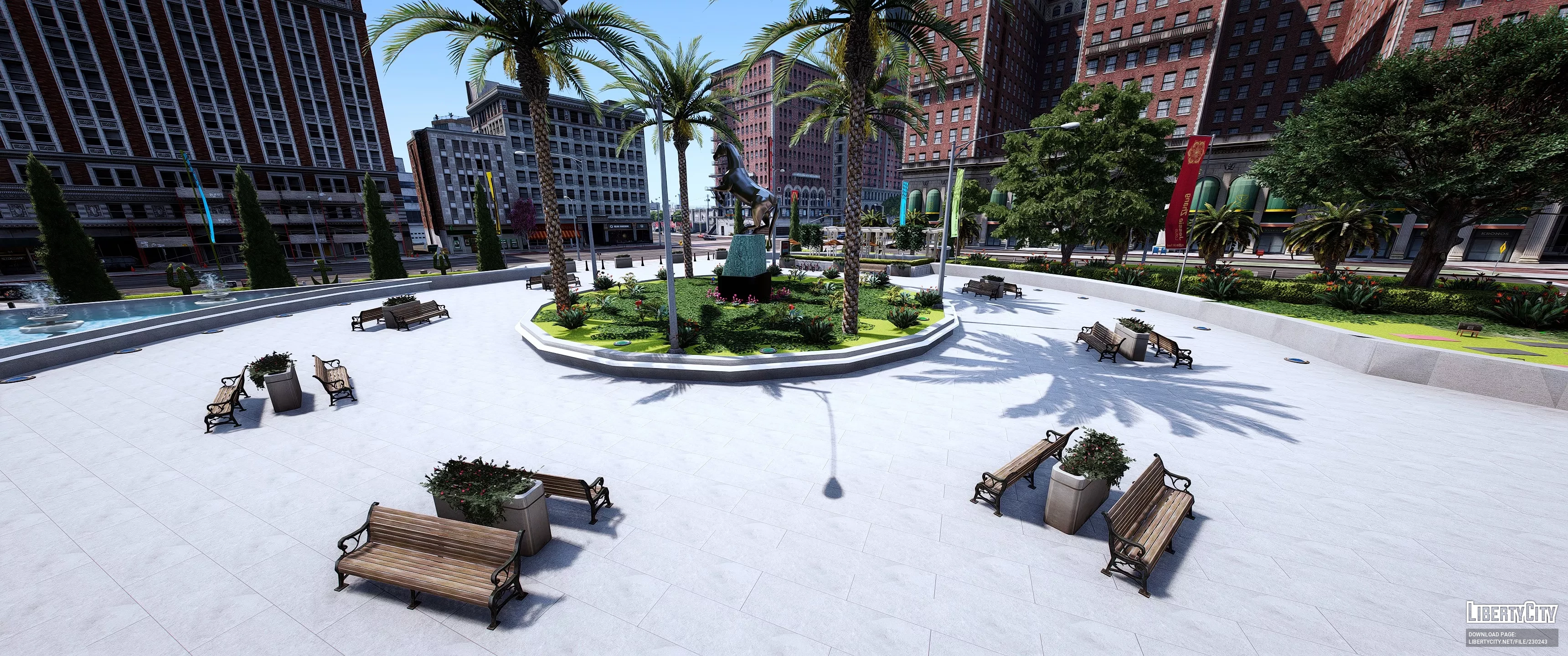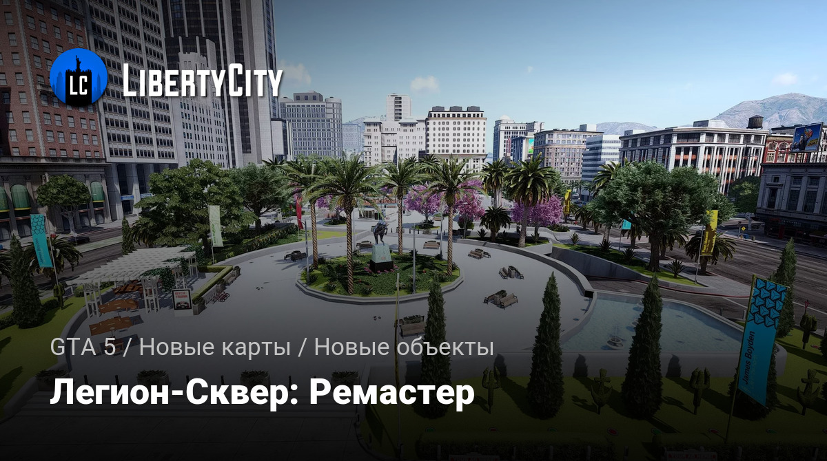 Legion Square Remastered — это современная и яркая площадь в самом центре города, окружённая высокими зданиями в классическом стиле. Центральная часть площади украшена ухоженными зелёными газонами, многочисленными пальмами и пышными цветущими деревьями с розовыми и сиреневыми кронами. В левой части площади расположен большой фонтан с чистой голубой водой и скульптурной композицией. По всей территории разбиты аккуратные аллеи и дорожки, установлены современные скамейки и уличные фонари. На газонах видны декоративные кустарники и ухоженные клумбы. Вдоль площади развешаны яркие флаги и баннеры, придающие месту праздничную атмосферу.