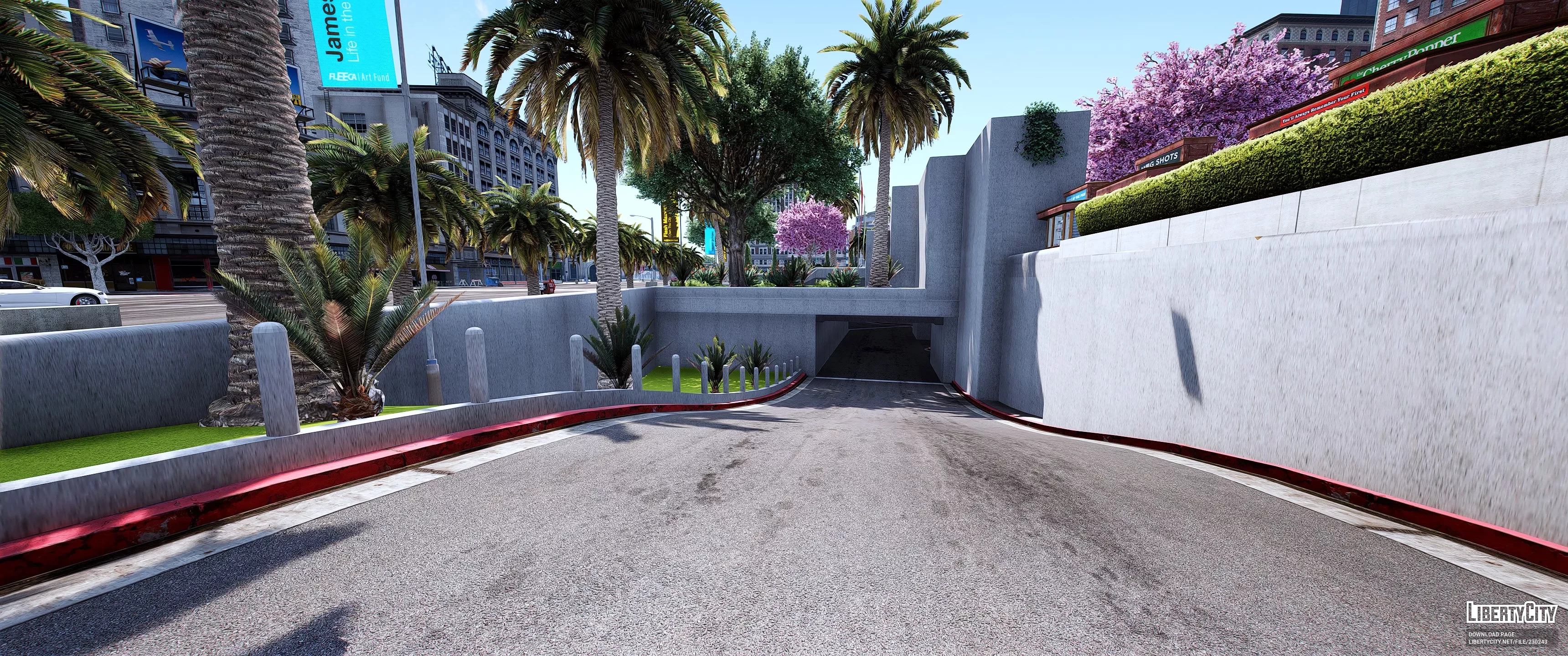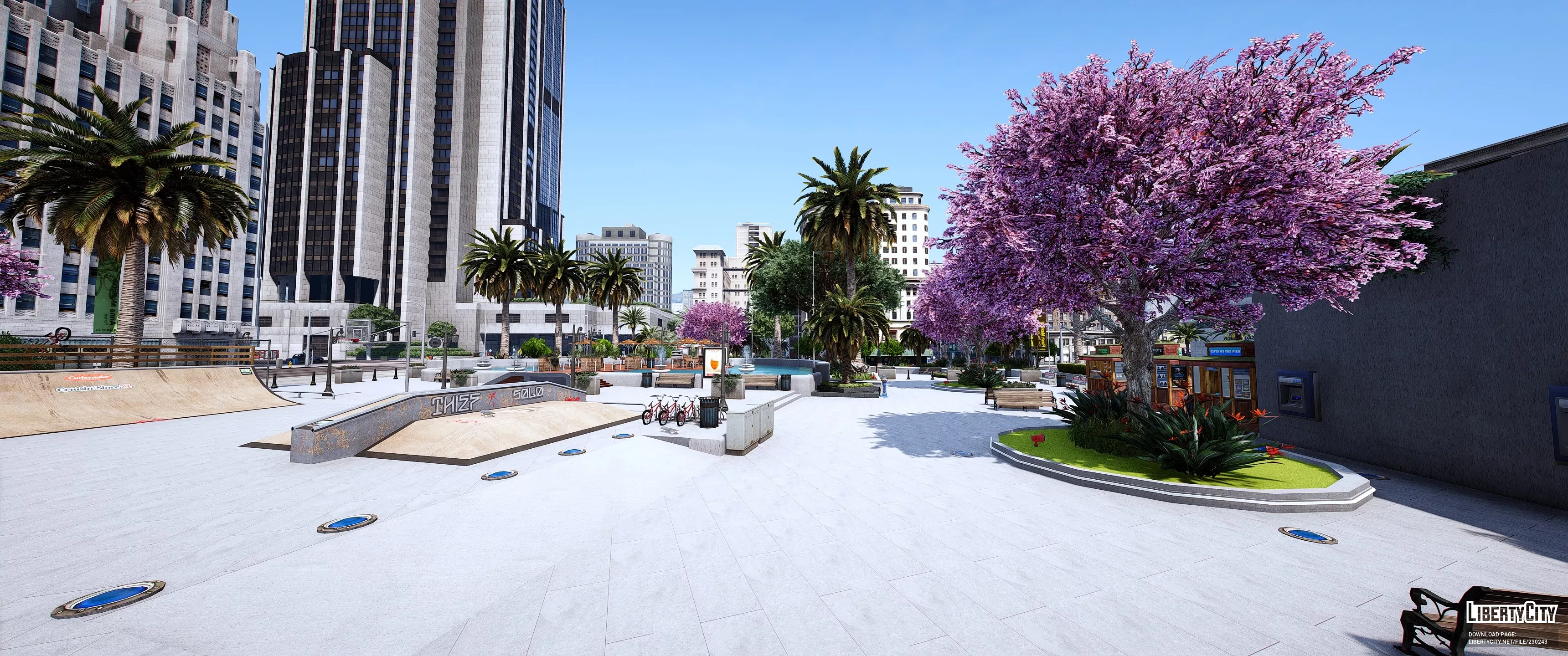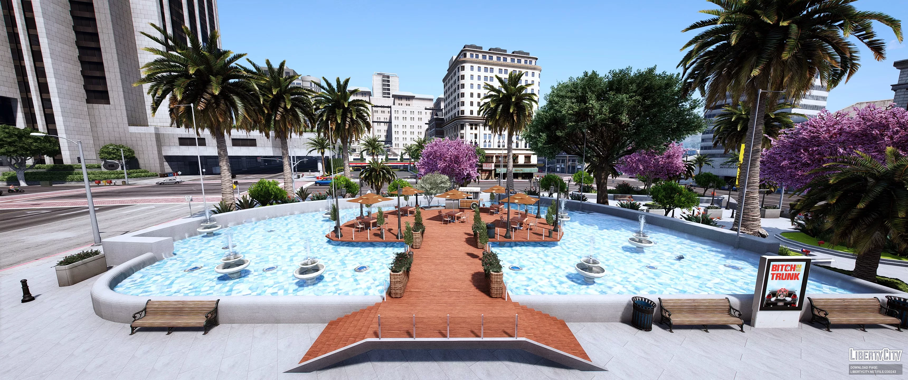 Legion Square Remastered — это современная и яркая площадь в самом центре города, окружённая высокими зданиями в классическом стиле. Центральная часть площади украшена ухоженными зелёными газонами, многочисленными пальмами и пышными цветущими деревьями с розовыми и сиреневыми кронами. В левой части площади расположен большой фонтан с чистой голубой водой и скульптурной композицией. По всей территории разбиты аккуратные аллеи и дорожки, установлены современные скамейки и уличные фонари. На газонах видны декоративные кустарники и ухоженные клумбы. Вдоль площади развешаны яркие флаги и баннеры, придающие месту праздничную атмосферу.