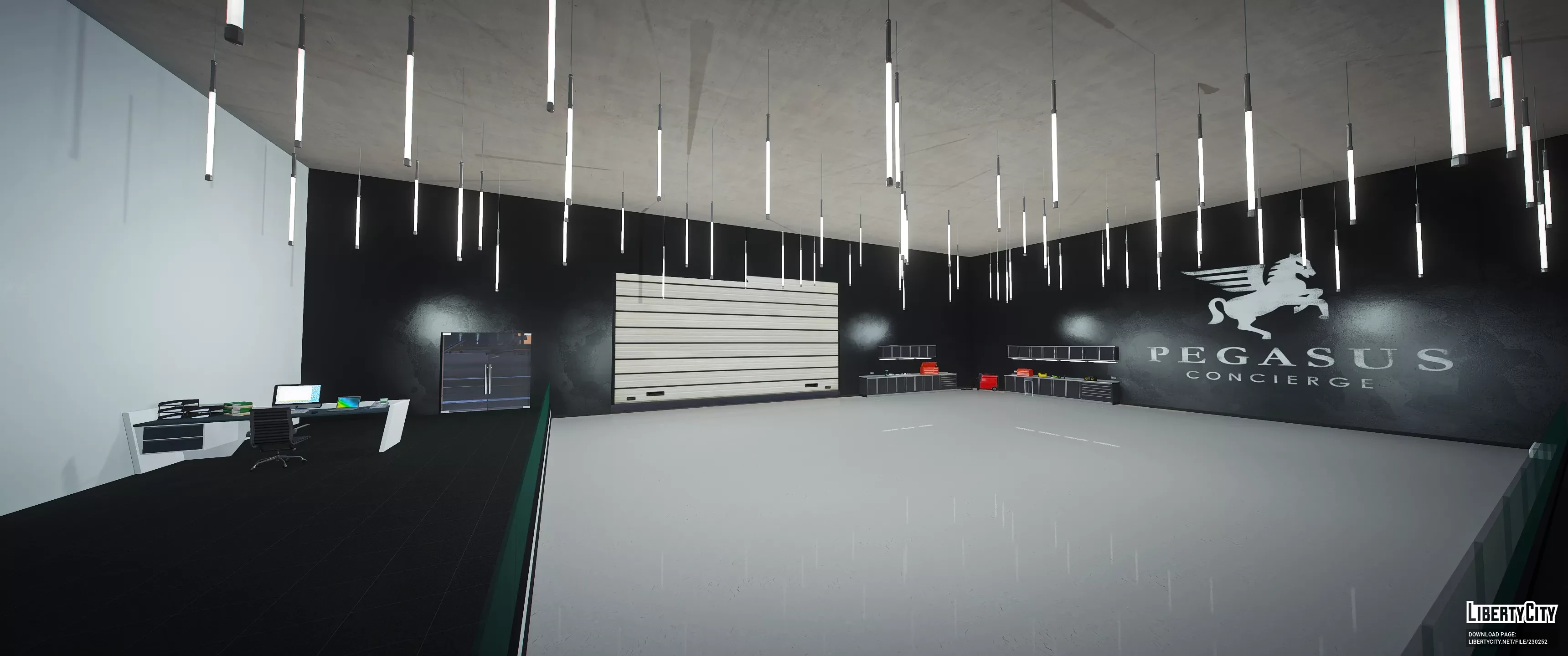 Здание выполнено в современном индустриальном стиле, с преобладанием светло-серых и белых оттенков. Фасад состоит из больших стеклянных панелей и гладких бетонных стен. На первом этаже видны широкие окна с тонированным стеклом, а также большие ворота с логотипом Pegasus. Сбоку пристроена металлическая лестница эвакуации с перилами, ведущая на верхние уровни. По периметру здания расположены наружные лестницы и пожарные выходы. Архитектура здания строгая и функциональная, с минималистичными элементами и акцентом на практичность. На фоне виднеется чистое небо и освещение заката, придающее фасаду мягкие золотистые оттенки.