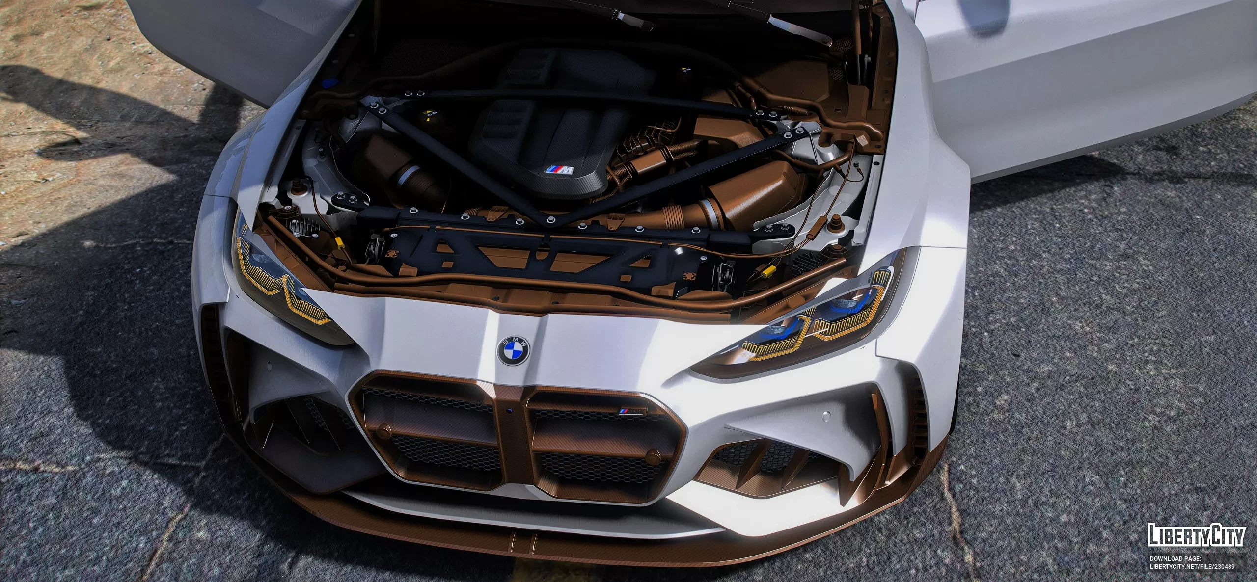BMW G82 M4 Adro для GTA 5. Передняя часть: Агрессивный передний бампер с массивными воздухозаборниками и карбоновыми вставками подчёркивает спортивный характер автомобиля. Капот выполнен в стиле Adro с выразительными выштамповками, что добавля...