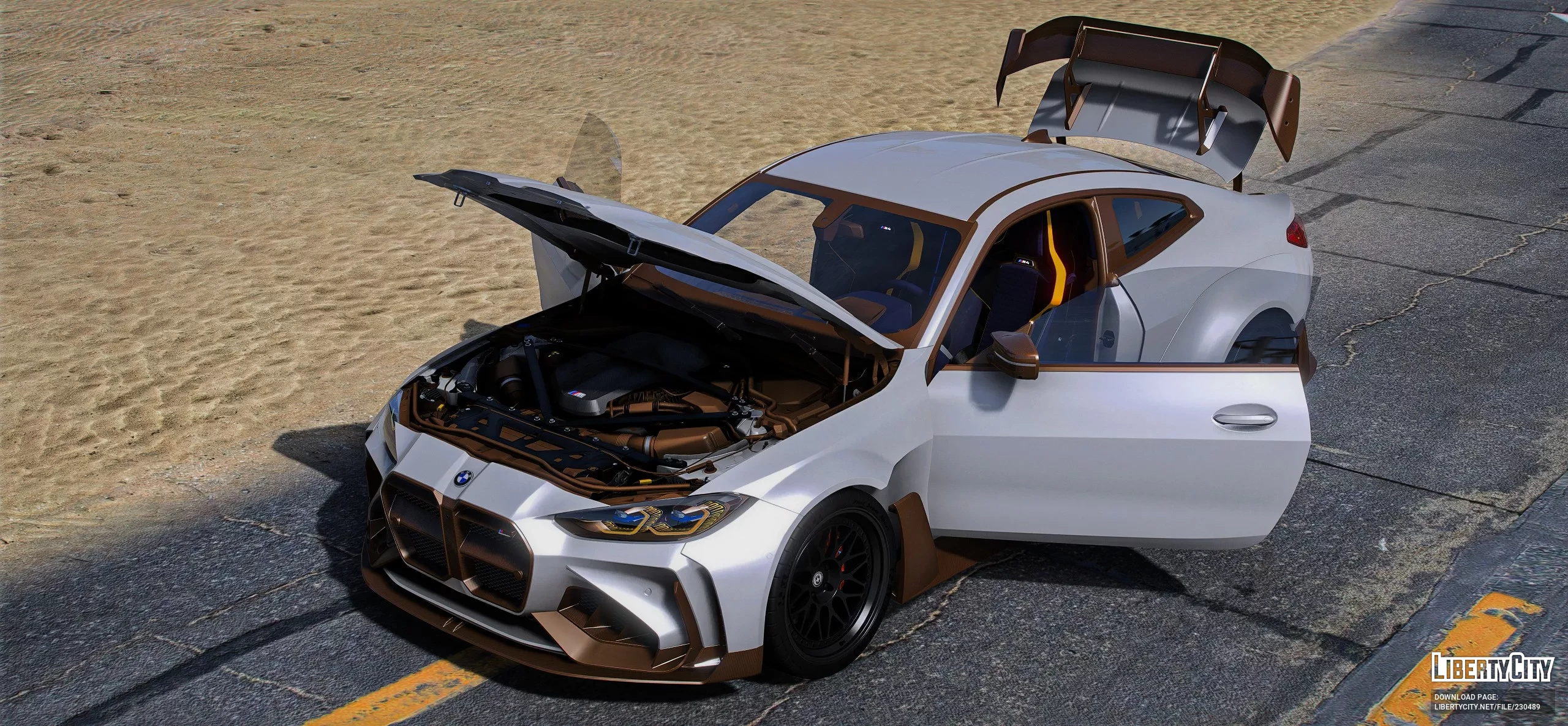 Кузов выполнен в стильном сочетании белого и бронзового цветов, что добавляет эксклюзивности и премиальности. Широкие колесные арки, аэродинамические элементы, карбоновые вставки и массивный задний спойлер намекают на высокую производительность и гоночные амбиции автомобиля. Черные легкосплавные диски и низкий клиренс завершают образ настоящего спортивного купе.