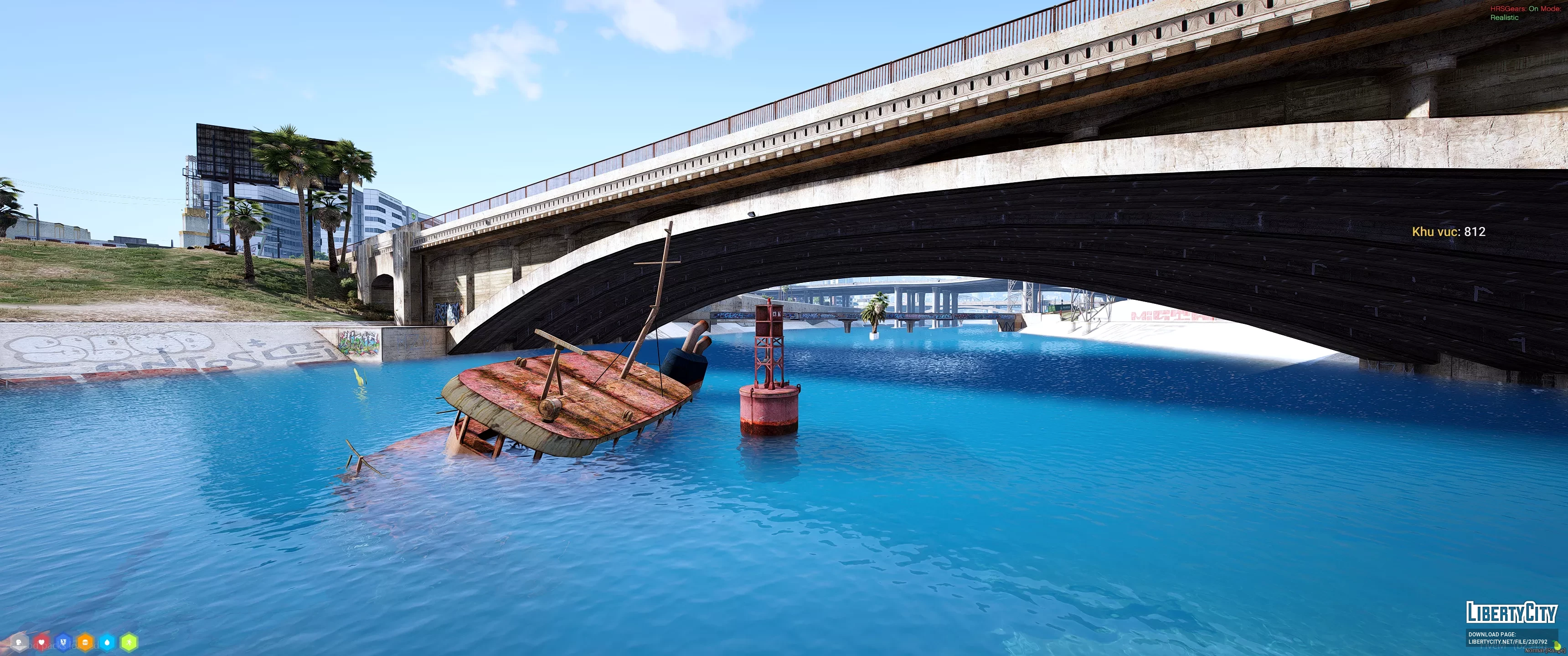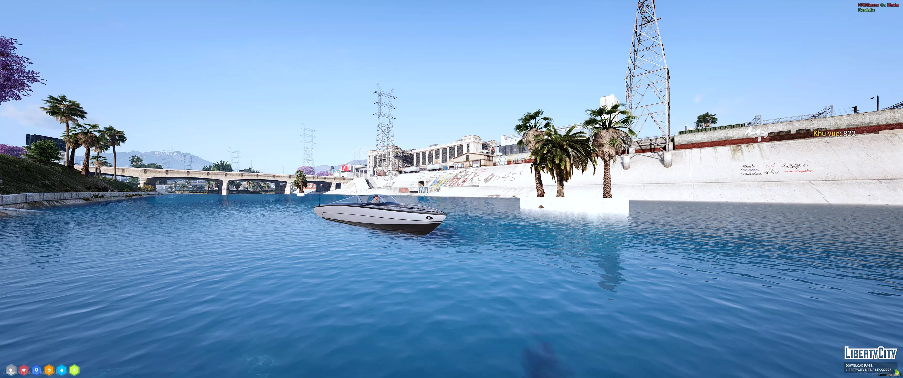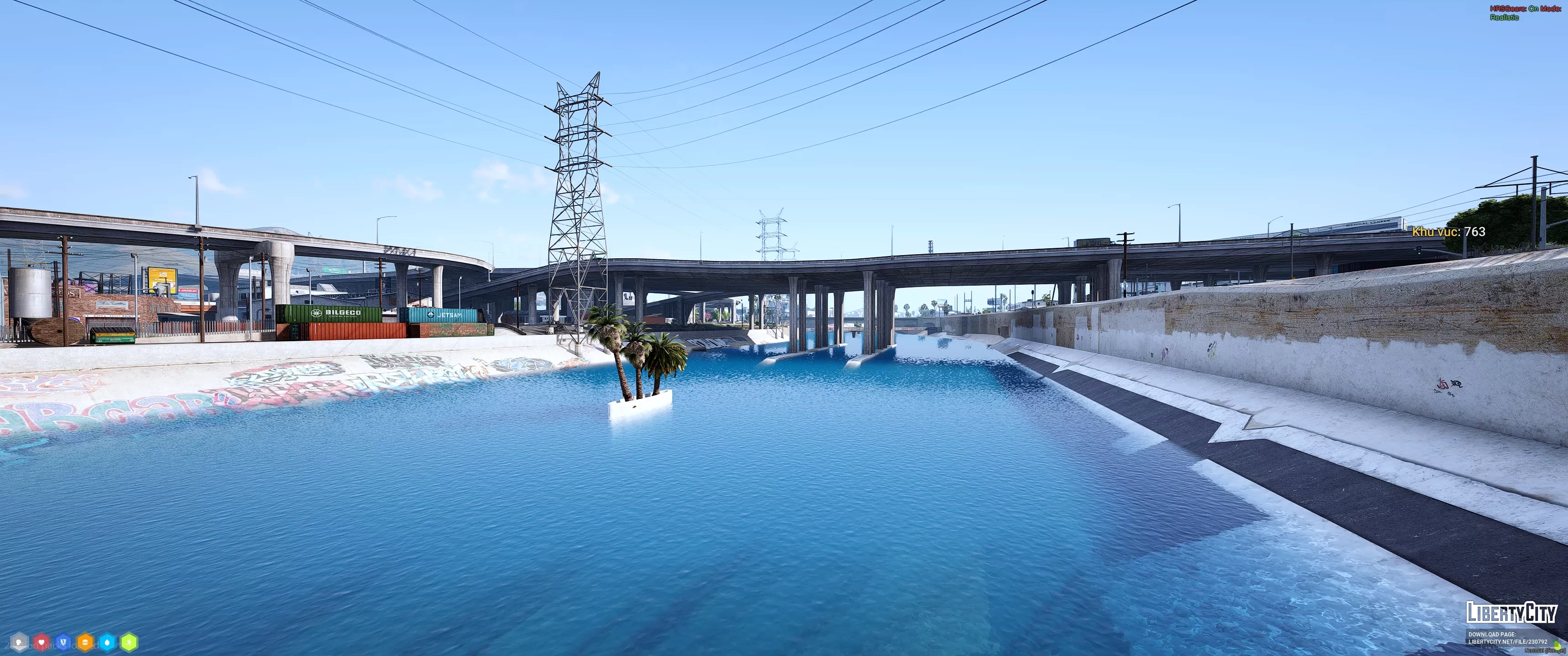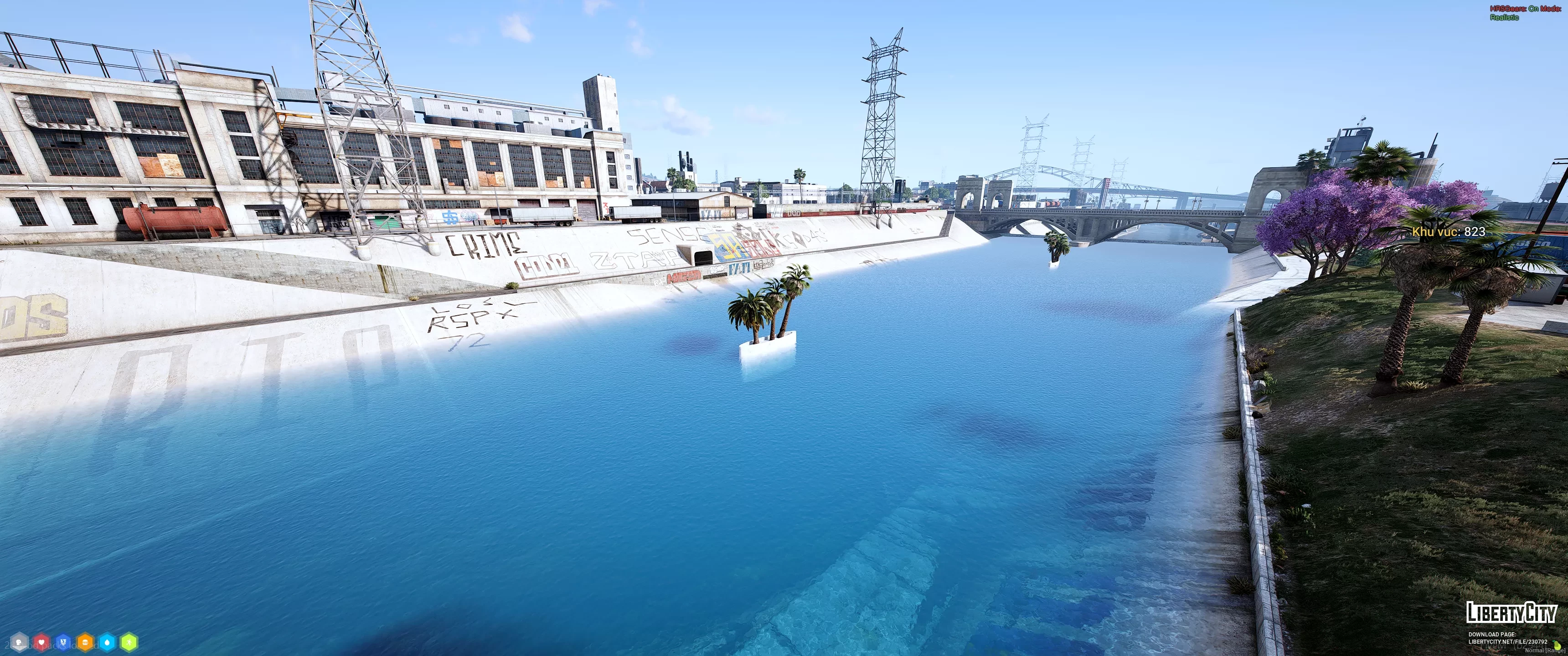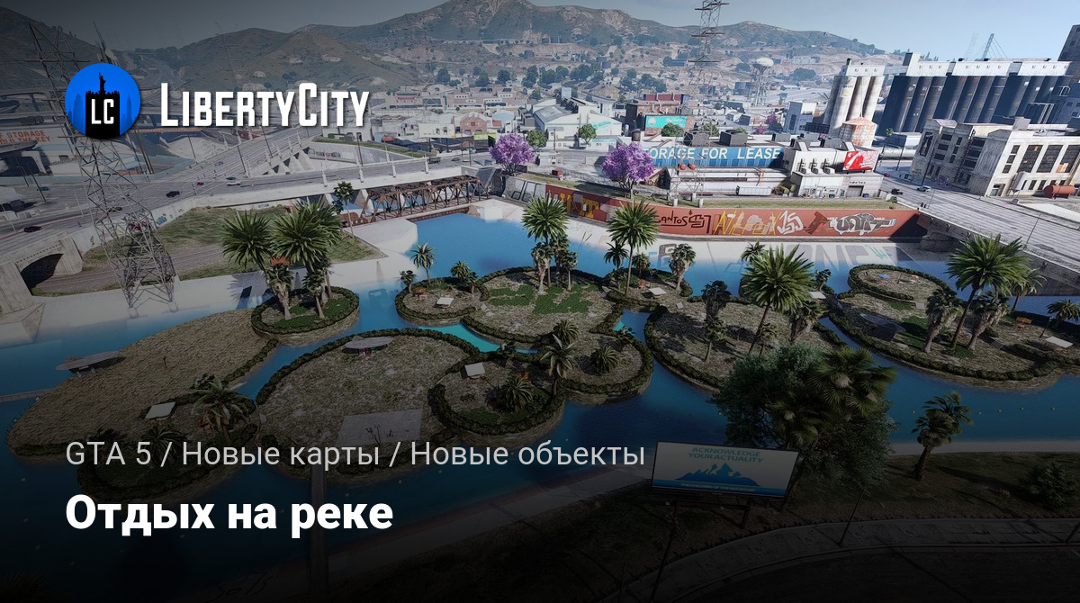 River Recreation представляет собой современную зону отдыха, расположенную в русле реки в городской черте. Территория оформлена в виде отдельных островков с зелёными газонами, окружённых чистой голубой водой. На островках высажены пальмы и декоративные кустарники, создающие атмосферу тропического курорта. Между островками проложены небольшие мостики и дорожки, позволяющие свободно перемещаться по территории. Вдоль берегов и на некоторых участках можно увидеть лавочки и места для отдыха. Вся зона окружена городской инфраструктурой, мостами и дорогами, а на заднем плане видны промышленные здания и жилые кварталы. Оформление дополняют рекламные щиты и граффити на стенах. Общий стиль — современный, яркий и привлекательный для посетителей.
