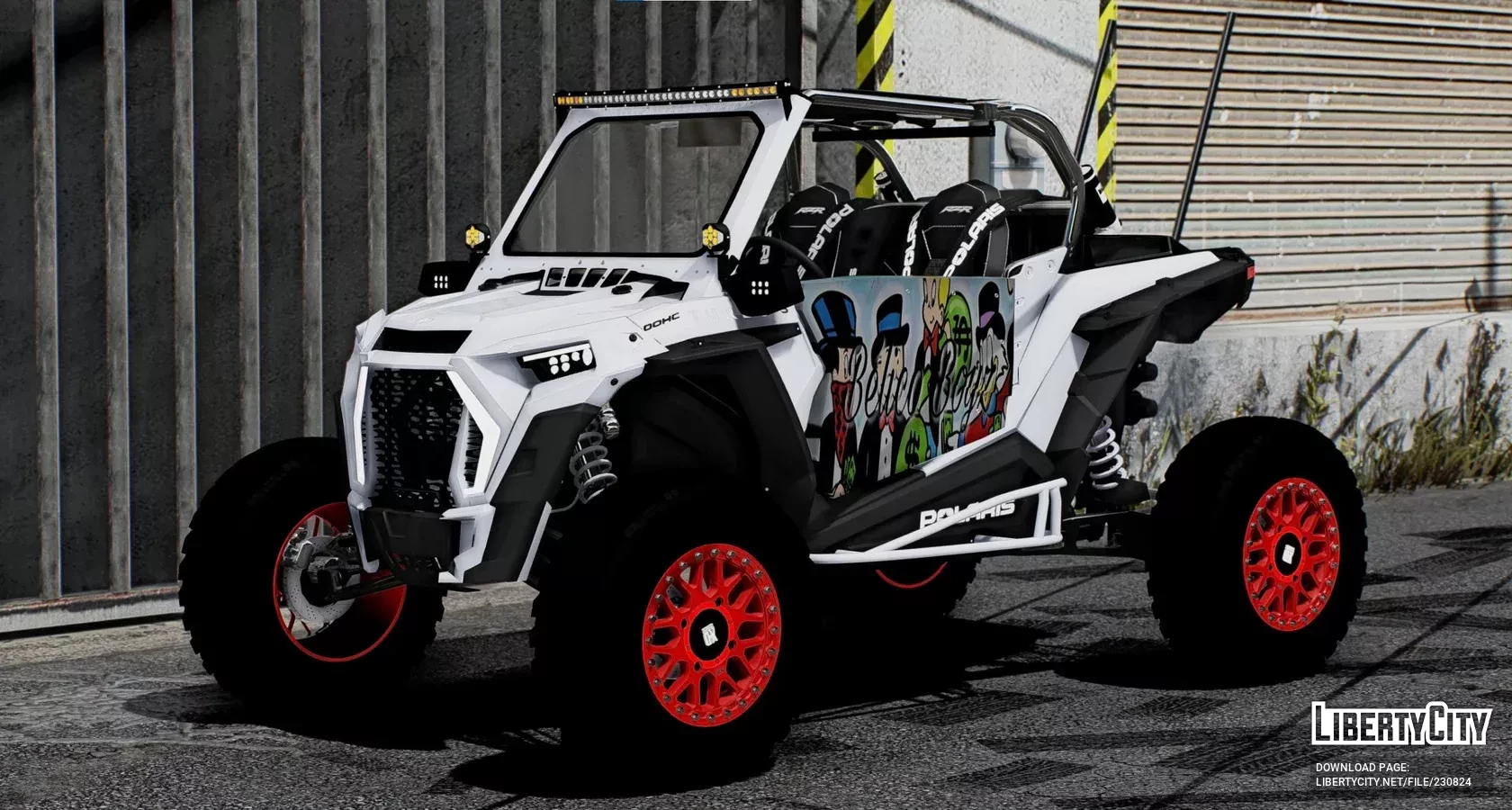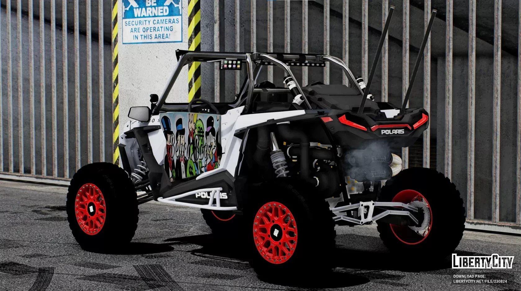 - Открытый металлический каркас безопасности и спортивные сиденья с логотипом Polaris подчеркивают экстремальный характер багги.